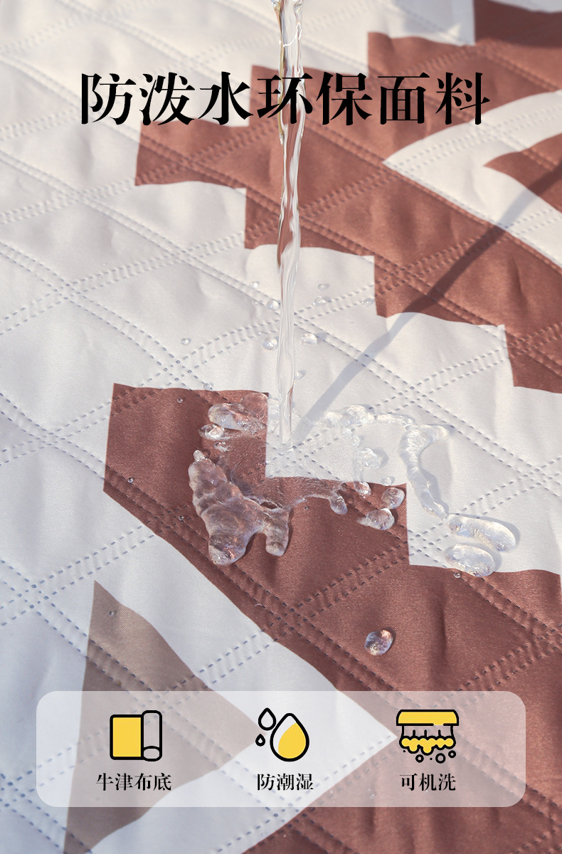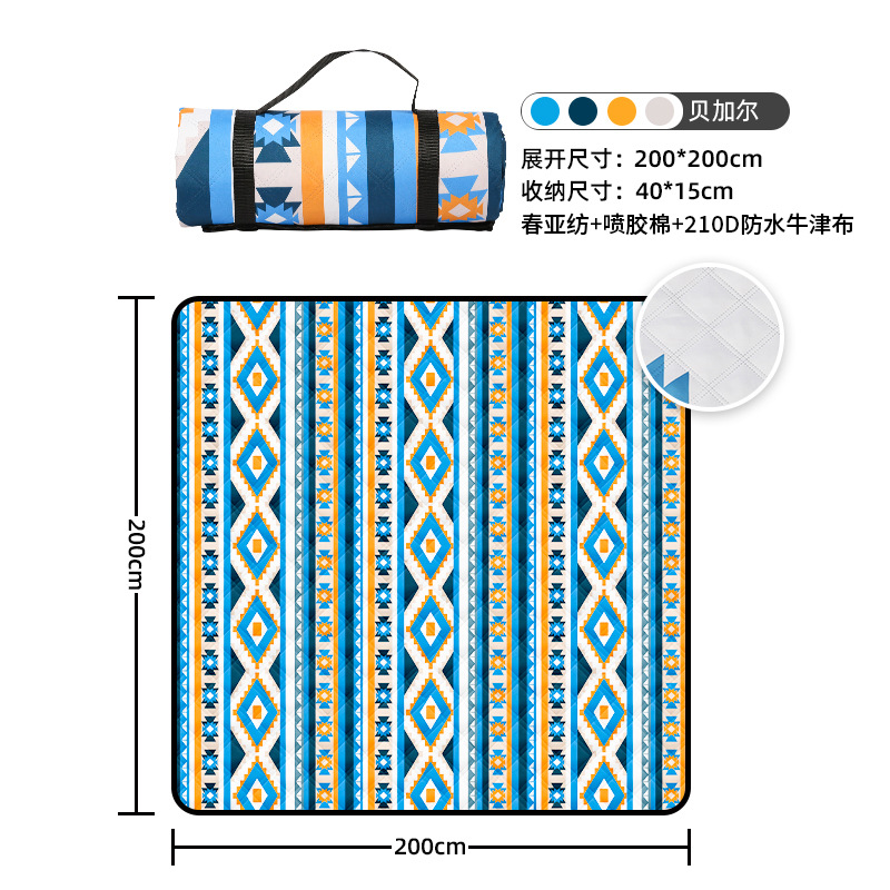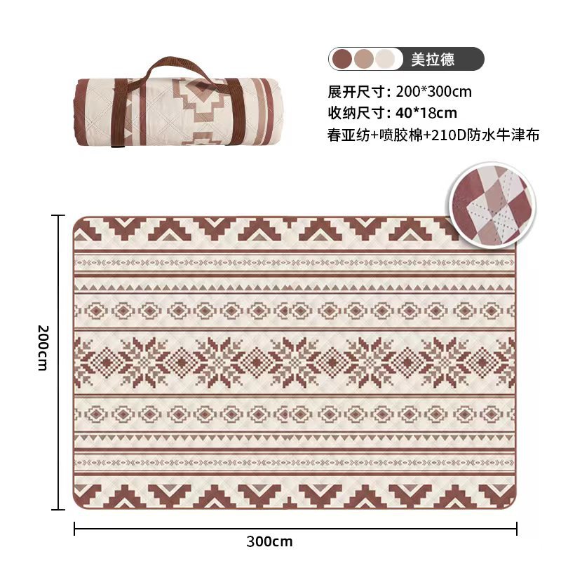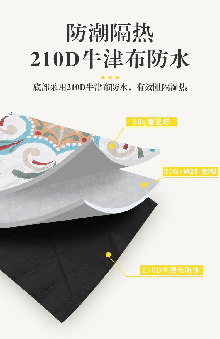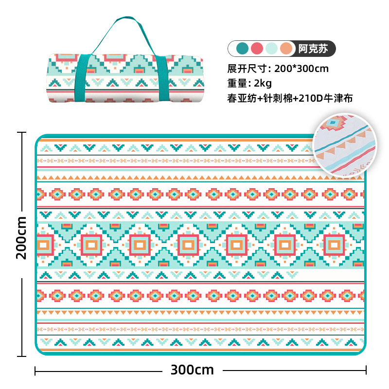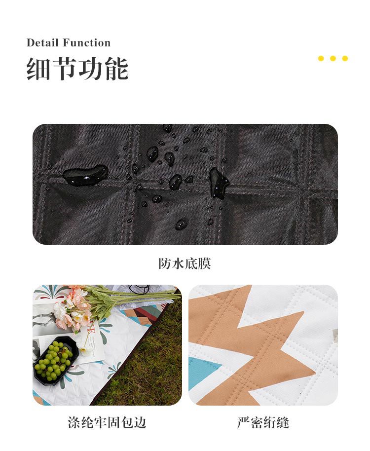 视频里面的是底部210D牛津布款式,300D牛津布防水(颜色蓝色)底部是老款,表面是没有防泼水的。作为野餐垫底部的防水层,牛津布抗撕裂,防水防潮,可机洗,柔韧性强,不会像PEVA在超声波绗缝中容易被打出洞,从而影响防水和品质,并且牛津布底可以适应大多数地形场景,我司中间的填充针刺棉是80gsm,市面上常规的是60gsm,更厚更舒适,接下来我司会陆续推出时下时尚的款式,尺寸也会把2*3米和3*3米的加进来,后期更会推出防水很好的铝膜底的超声波野餐垫,具有更好的防水能力,可以隔绝冷热,铺在帐篷里面露营非常合适,耐撕裂,厚度更厚(克重达到      110gsm左右,市面上PEVA 75gsm),耐磨性更强,如对我们后期推出的新品感兴趣,欢迎咨询选购。