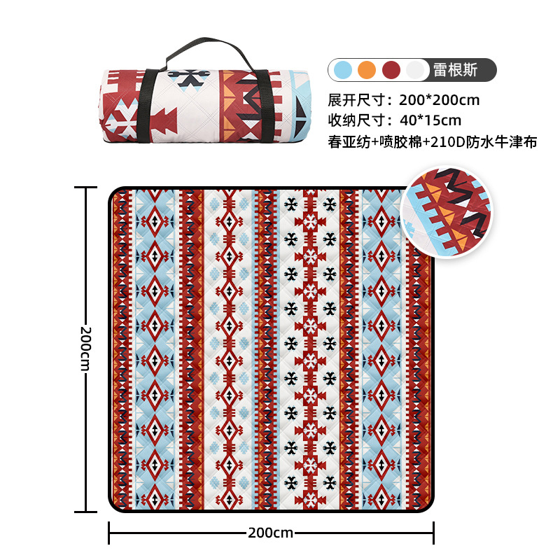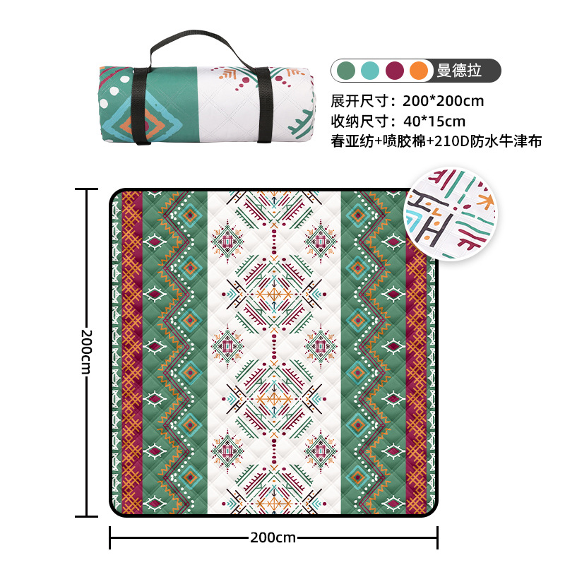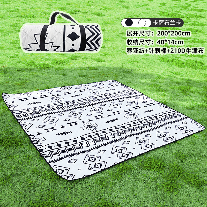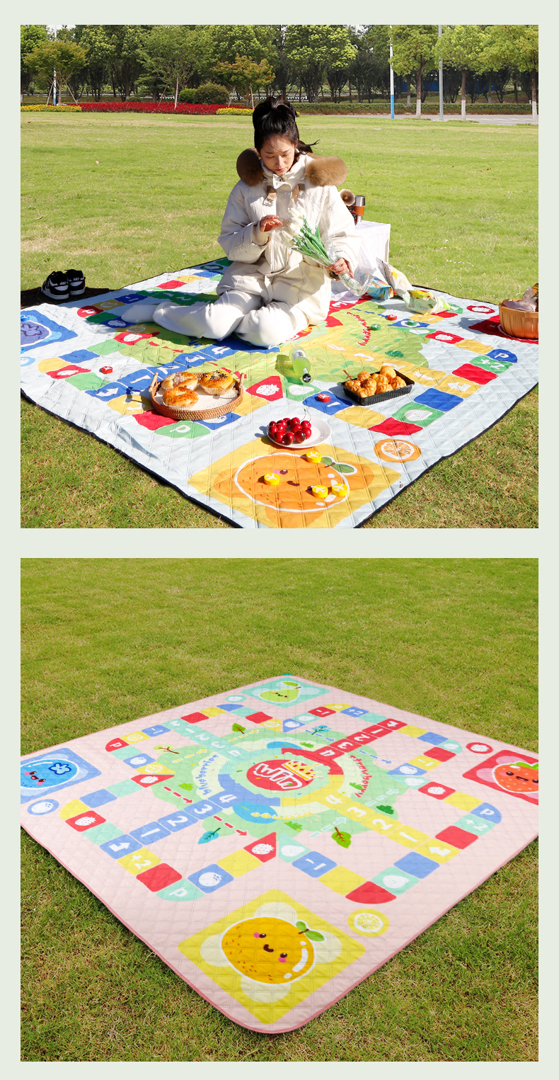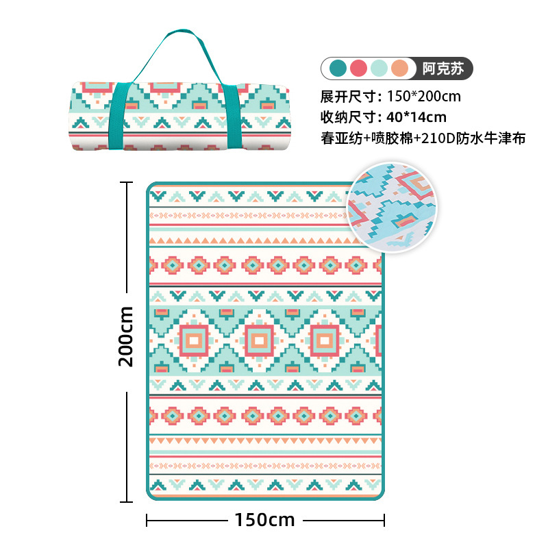 视频里面的是底部210D牛津布款式,300D牛津布防水(颜色蓝色)底部是老款,表面是没有防泼水的。作为野餐垫底部的防水层,牛津布抗撕裂,防水防潮,可机洗,柔韧性强,不会像PEVA在超声波绗缝中容易被打出洞,从而影响防水和品质,并且牛津布底可以适应大多数地形场景,我司中间的填充针刺棉是80gsm,市面上常规的是60gsm,更厚更舒适,接下来我司会陆续推出时下时尚的款式,尺寸也会把2*3米和3*3米的加进来,后期更会推出防水很好的铝膜底的超声波野餐垫,具有更好的防水能力,可以隔绝冷热,铺在帐篷里面露营非常合适,耐撕裂,厚度更厚(克重达到      110gsm左右,市面上PEVA 75gsm),耐磨性更强,如对我们后期推出的新品感兴趣,欢迎咨询选购。