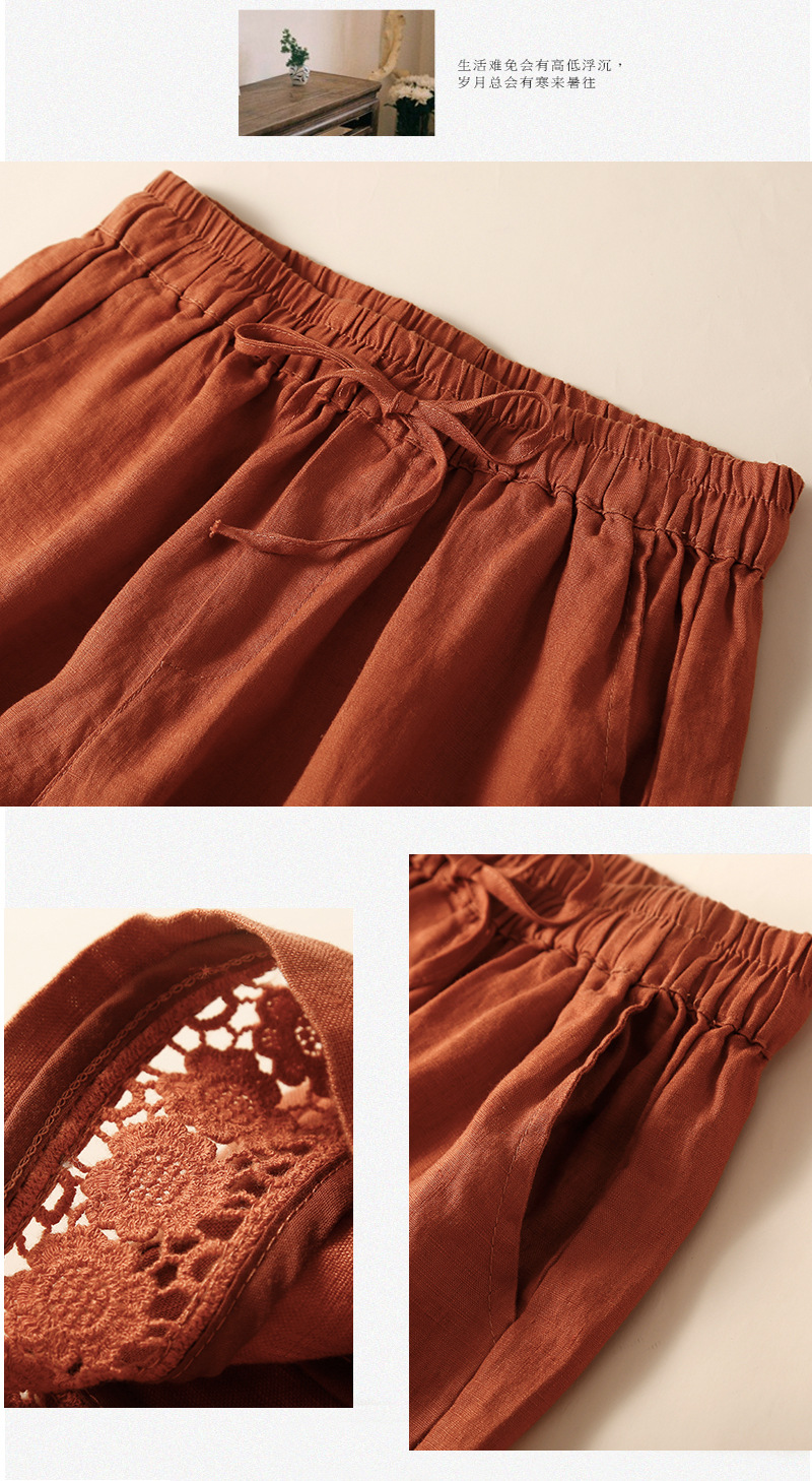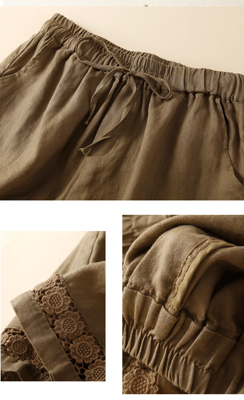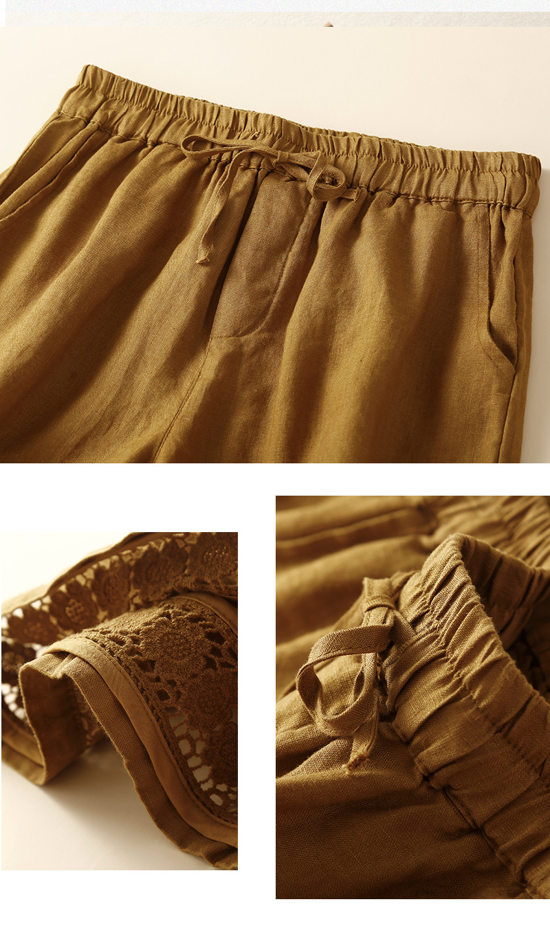 8가지 색상, 레트로 스타일의 레이스 디테일 코튼 린넨 팬츠, 여성용 끈 조절 허리밴드, 와이드 팬츠, 편안한 캐주얼 팬츠, 반바지, 하이웨이스트스토어 가기