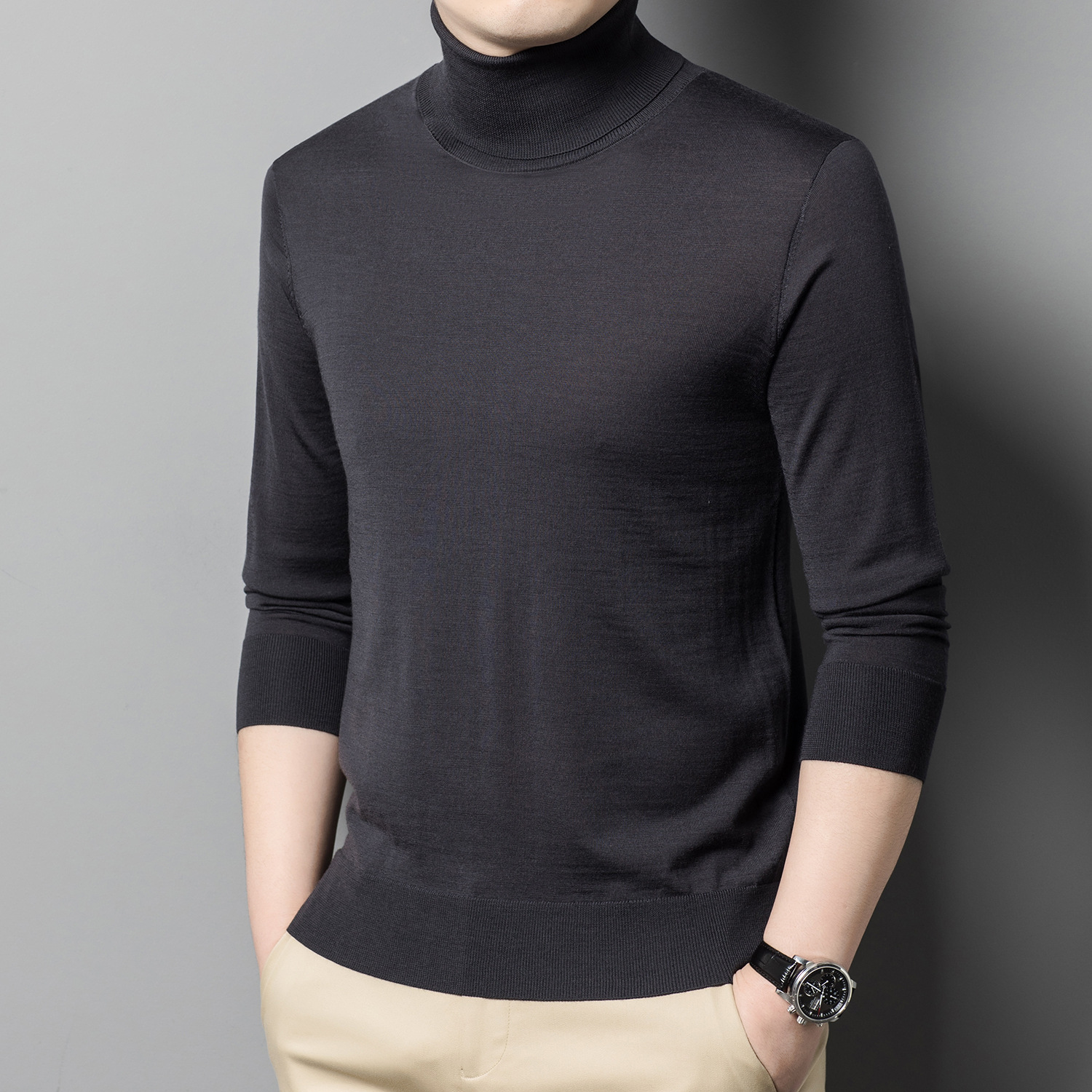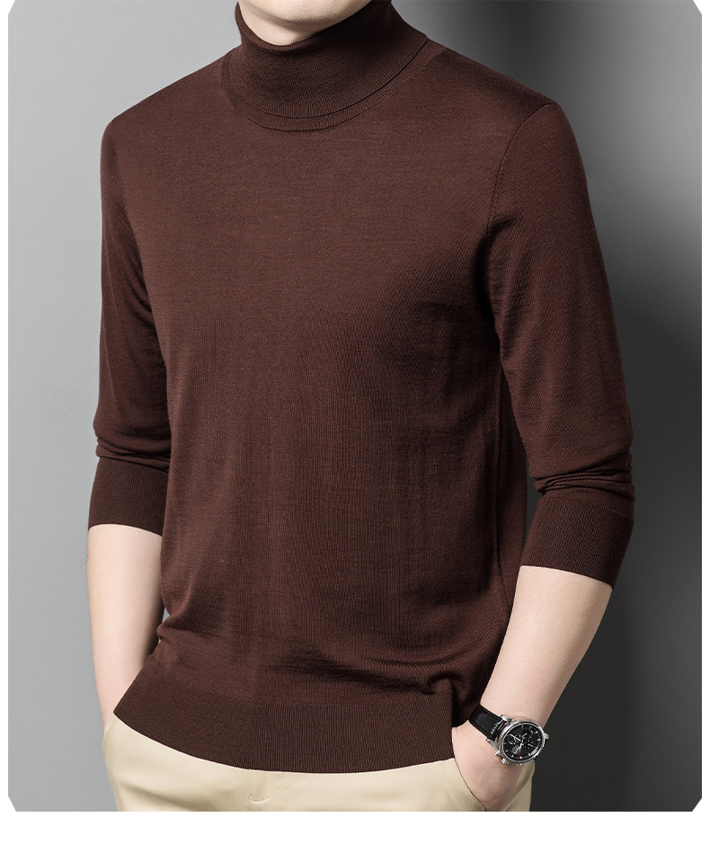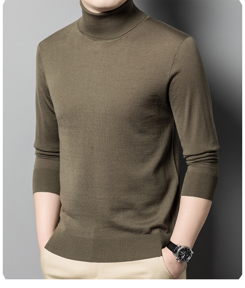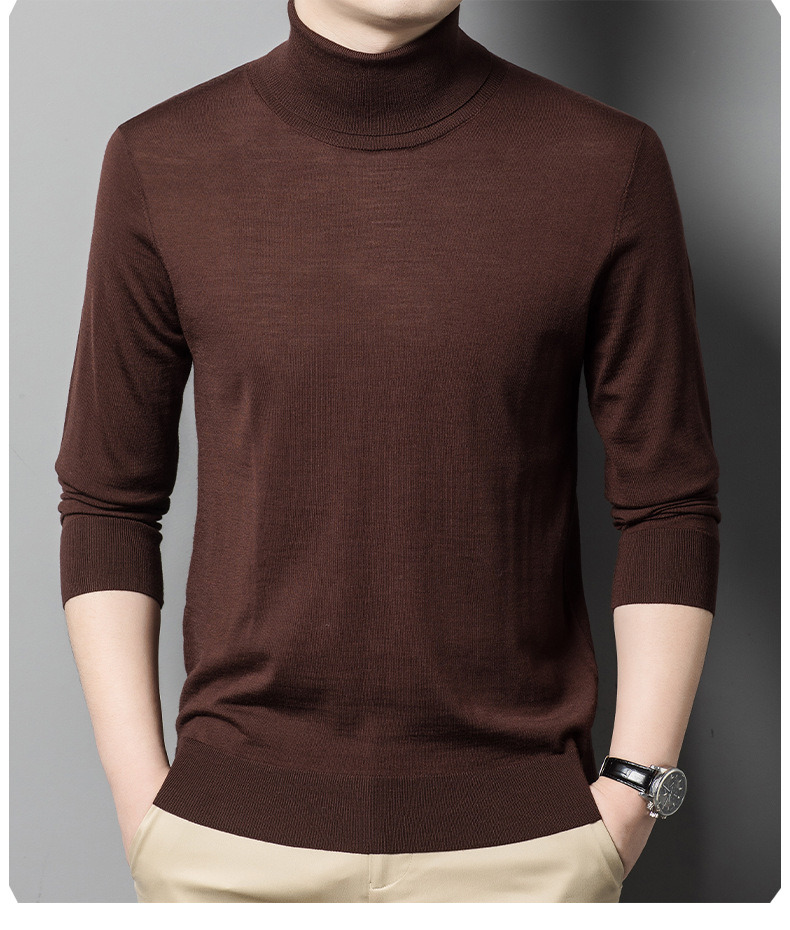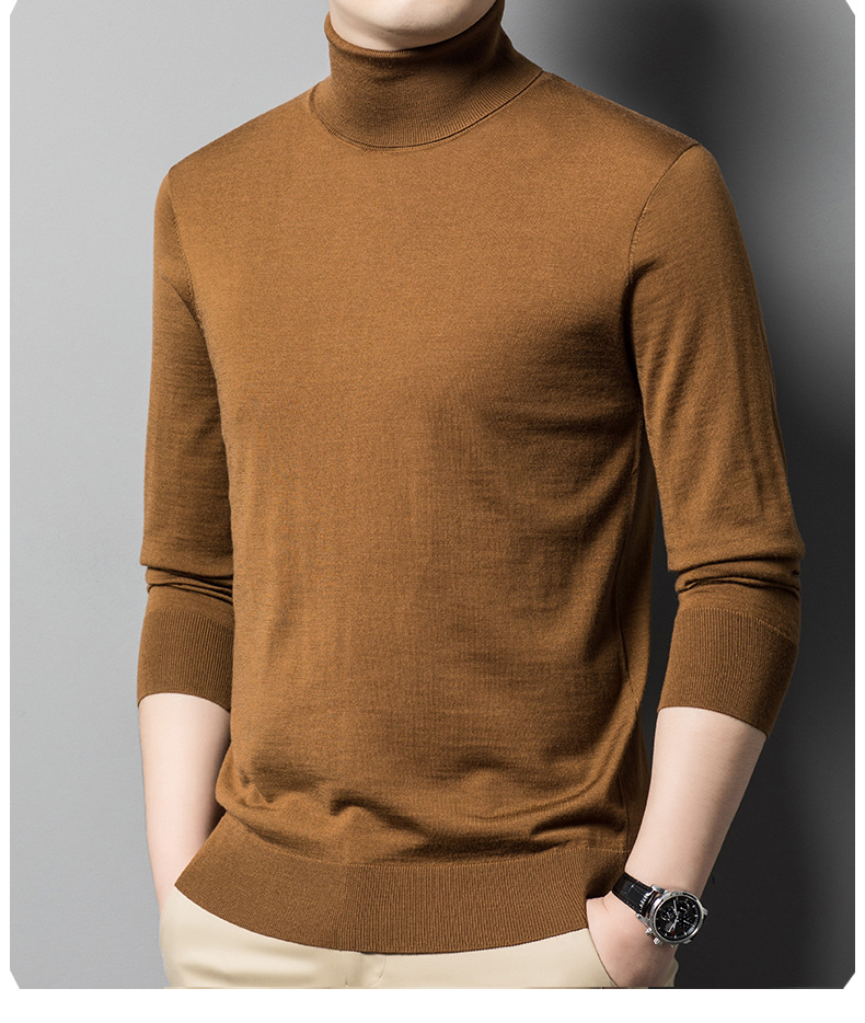세탁기 사용 가능 고급 울 스웨터, 더블 라펠 남성용 100% 순모 긴팔 하이넥 니트 스웨터, 얇은 베이스 레이어 스웨터