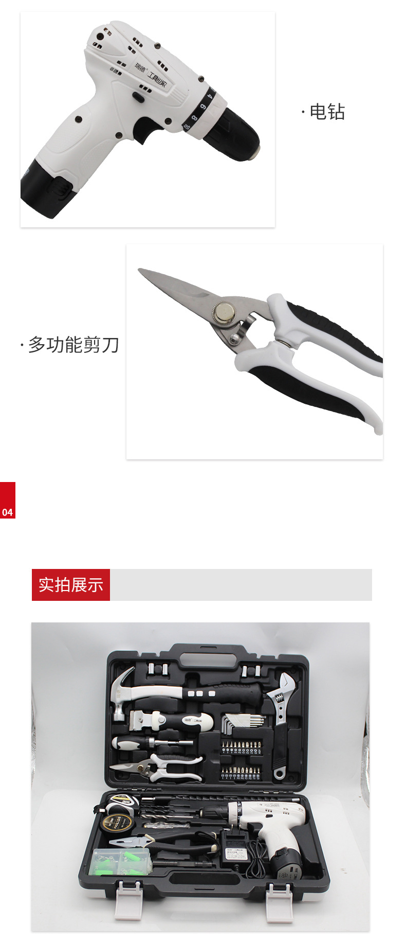 가정용 하드웨어 도구 상자 세트 12V 리튬 전기 드릴 무선 권총 드릴 전기 드라이버의 레드 86 조각 세트
