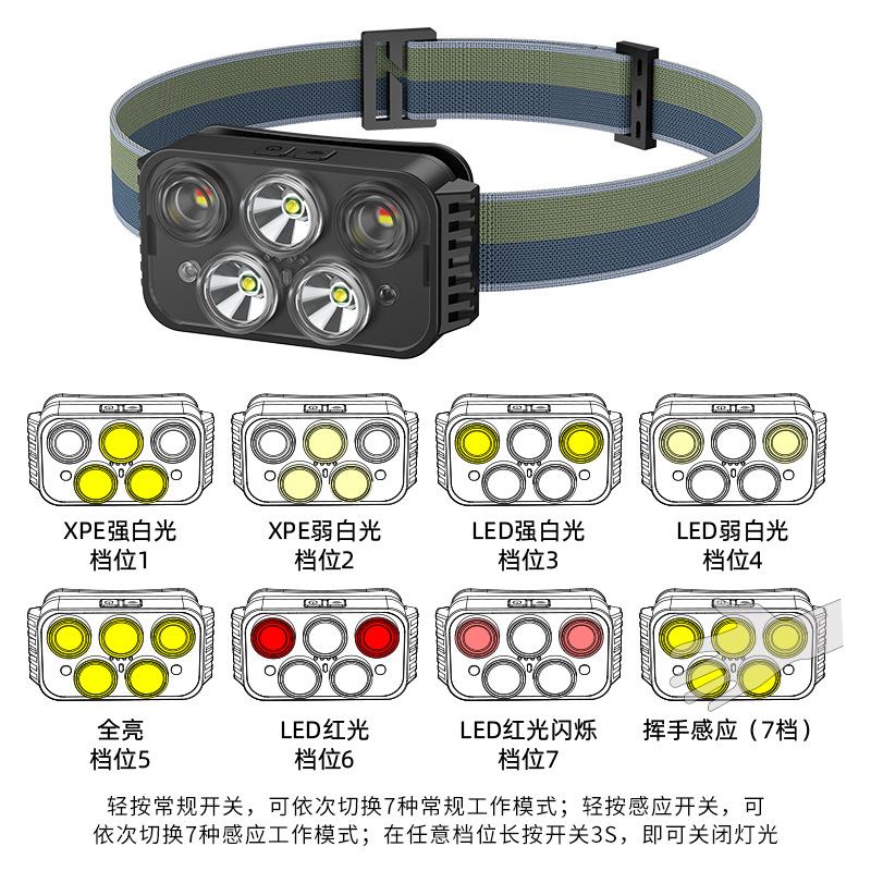 4.头部开关:天然橡胶材质,表面防滑处理,轻触开关切换照明模式.