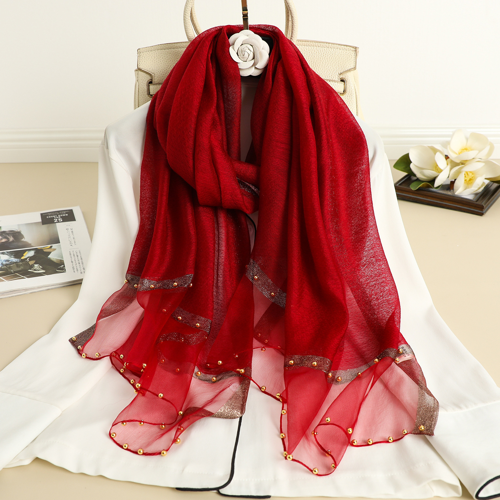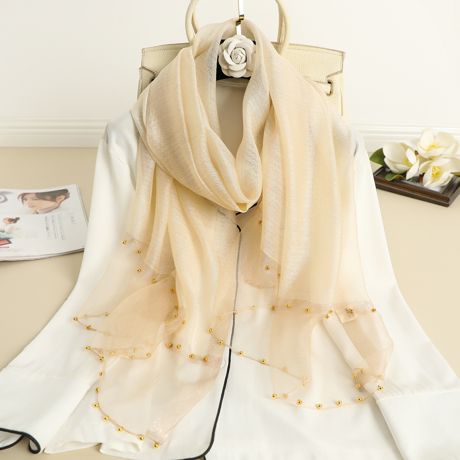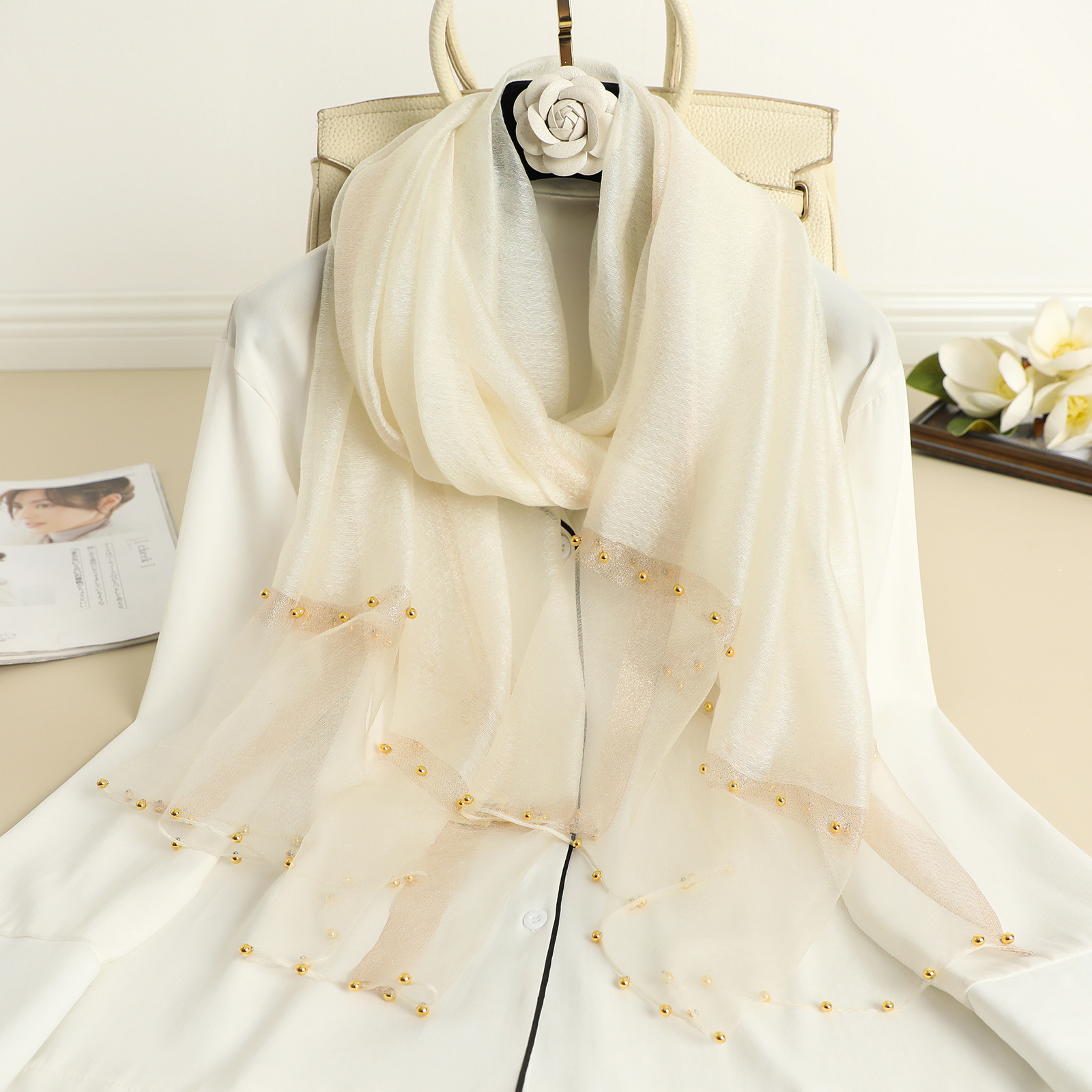 2022 새로운 스카프 여성의 얇은 구슬 단색 목도리 골드 실크 성격 스카프 인공 실크 스카프 봄과 가을 도매