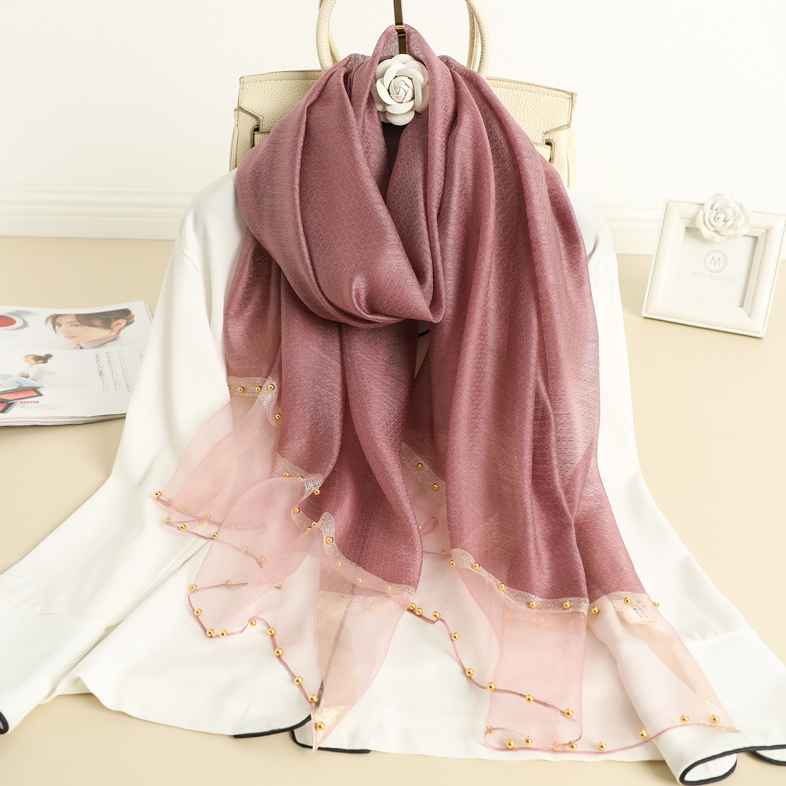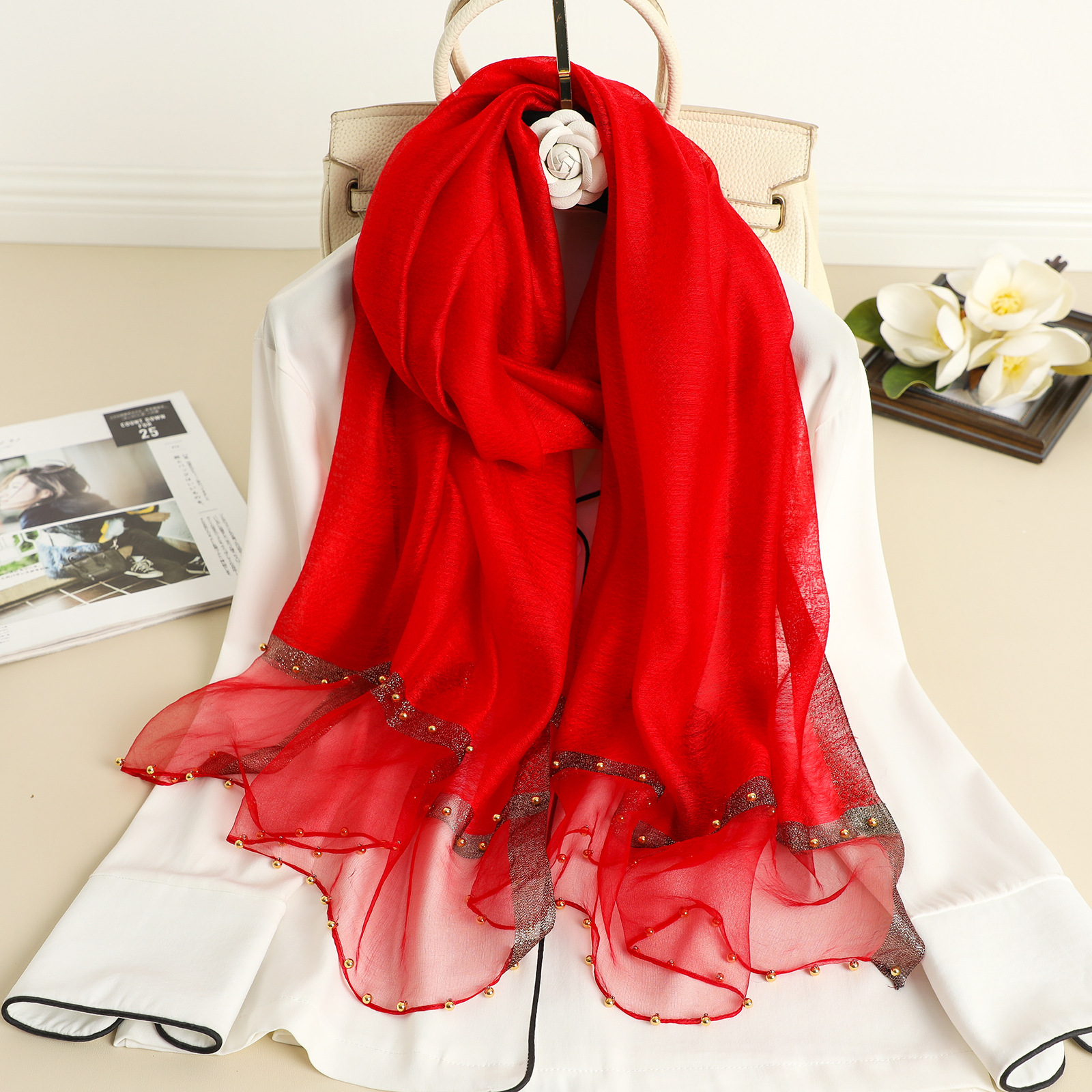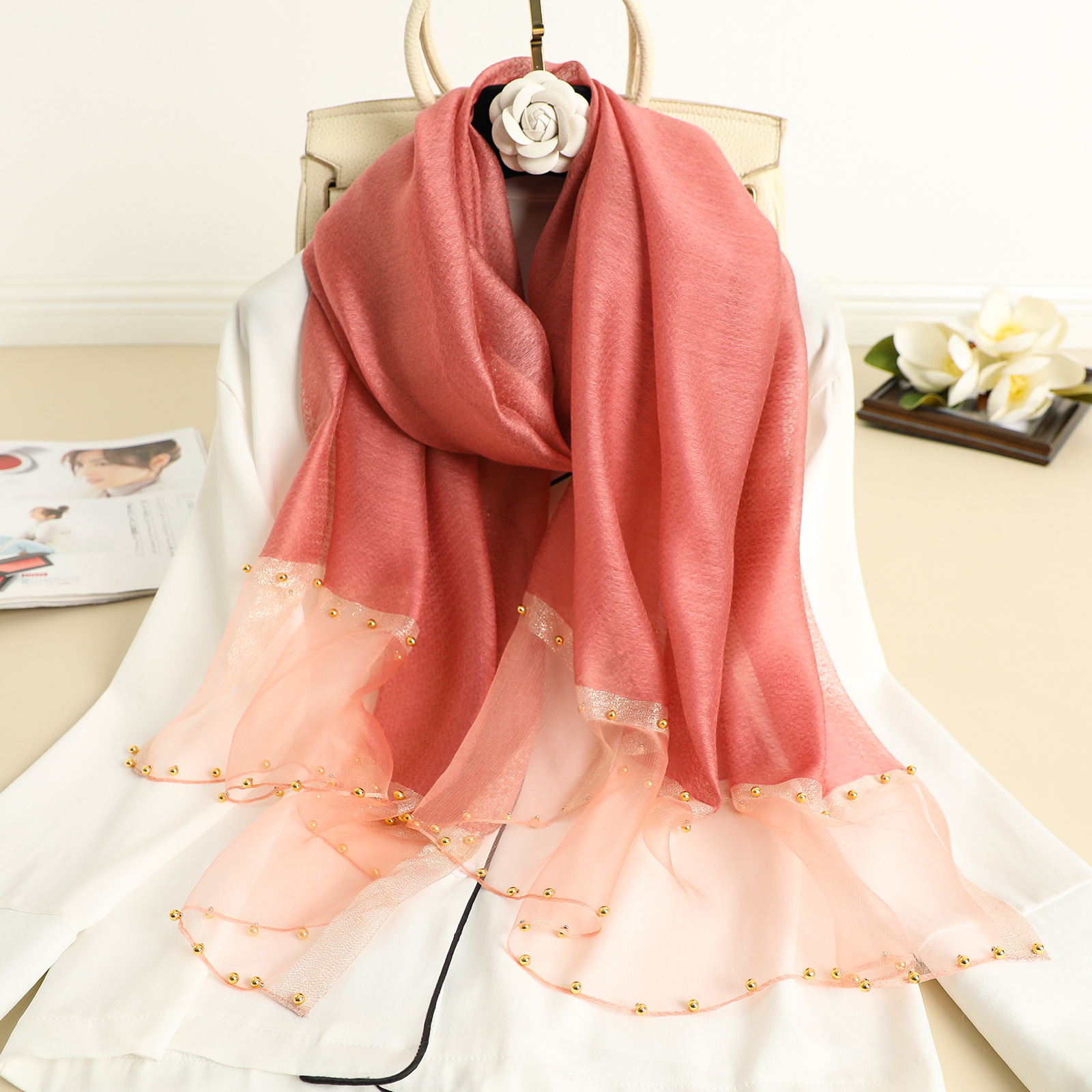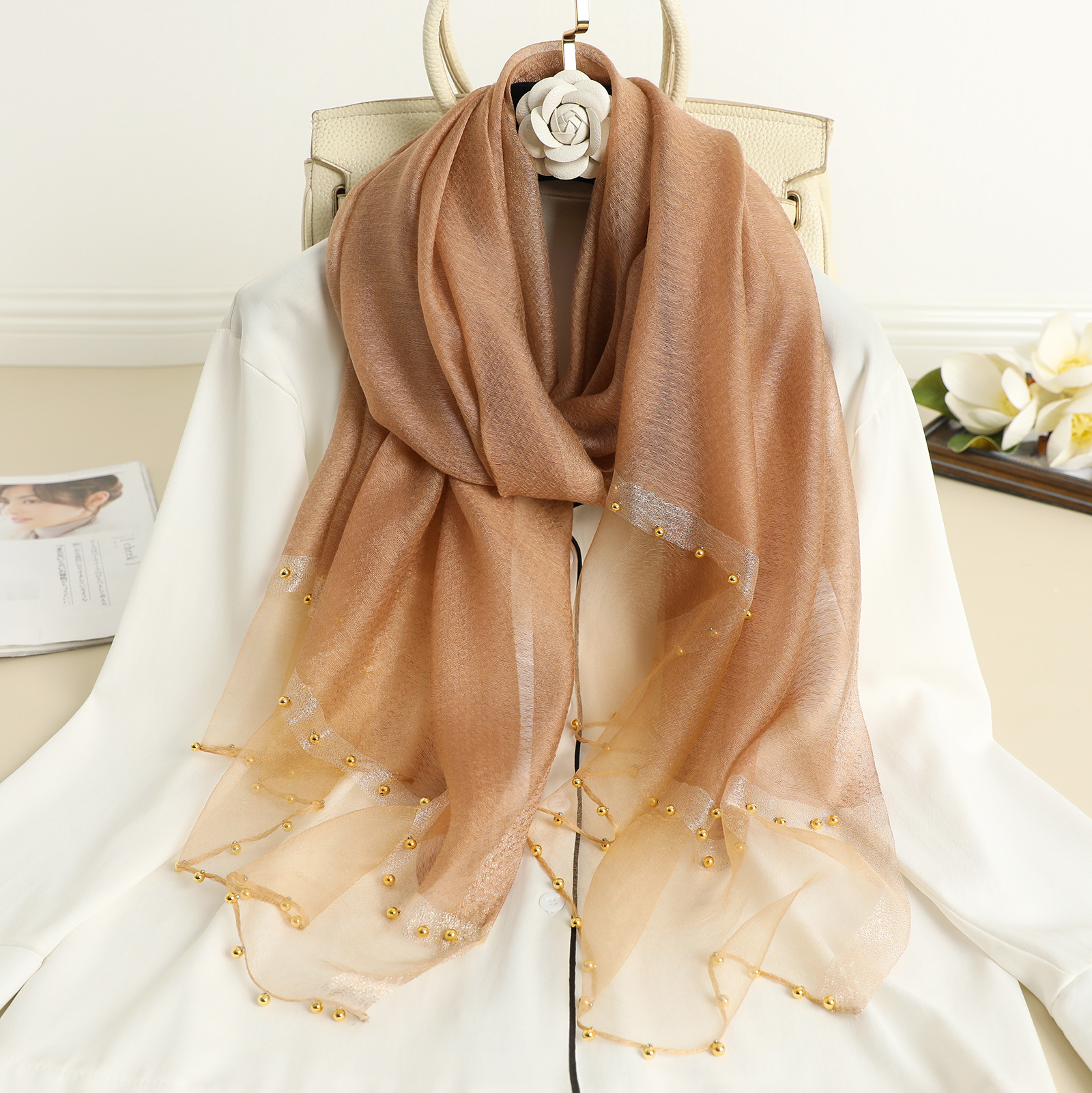 2022 새로운 스카프 여성의 얇은 구슬 단색 목도리 골드 실크 성격 스카프 인공 실크 스카프 봄과 가을 도매