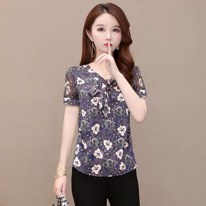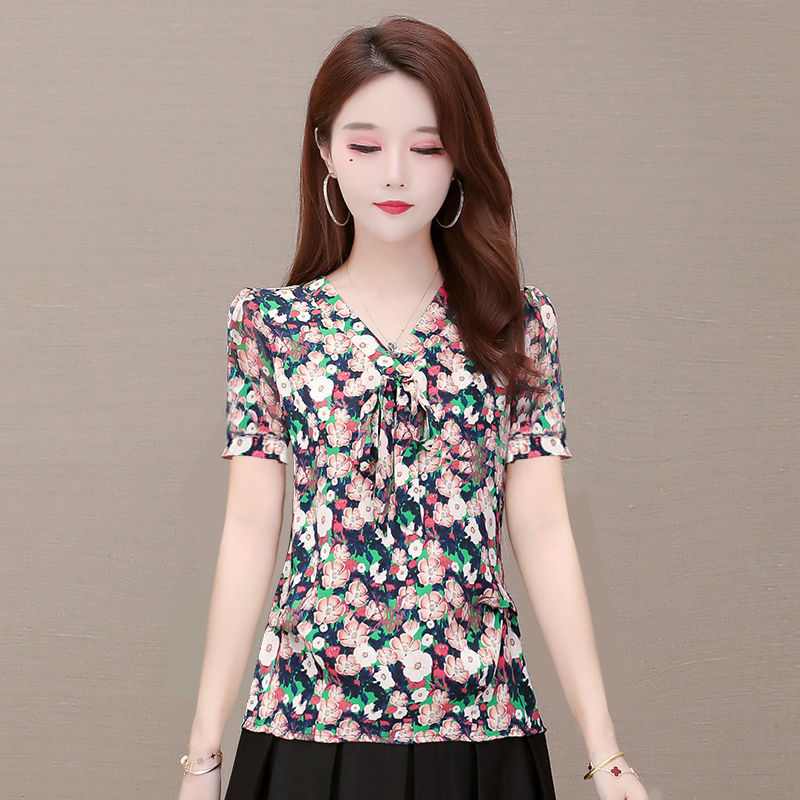 여성을위한 꽃 쉬폰 탑 여름 2024 새로운 우아한 슬림 핏 배꼽 커버 슬리밍 유행 연령 감소 짧은 소매 서양식 작은 셔츠