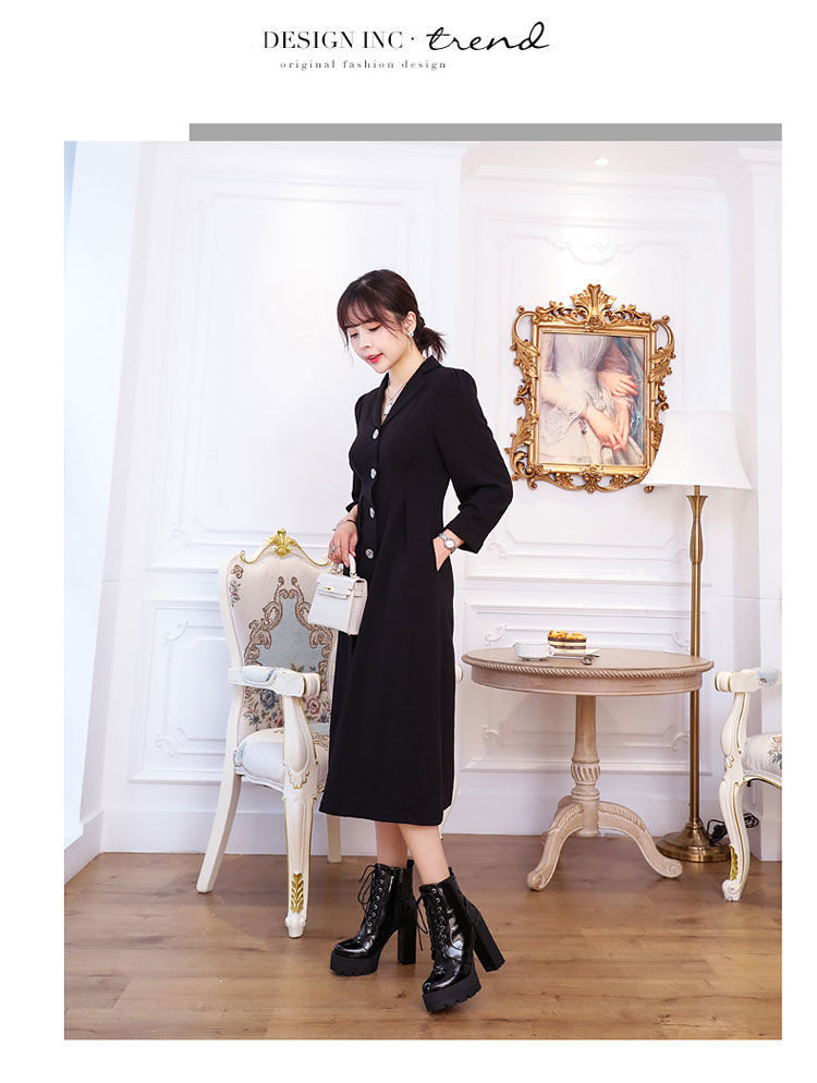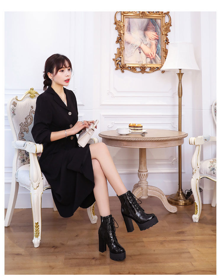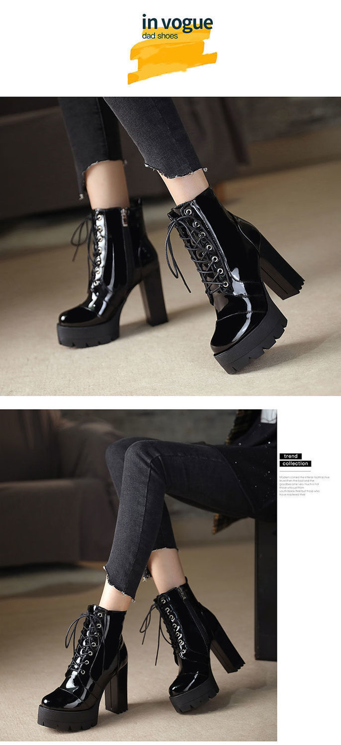 2022 봄과 가을 새로운 하이힐 앵클 부츠 여성용 청키 힐 라운드 토 방수 마틴 부츠 모든 매치 슬리브 짧은 래커 가죽 부츠스토어 가기