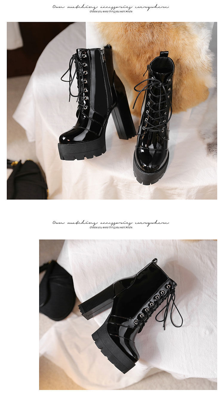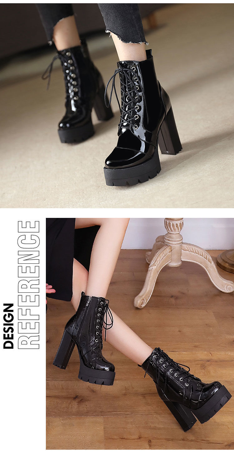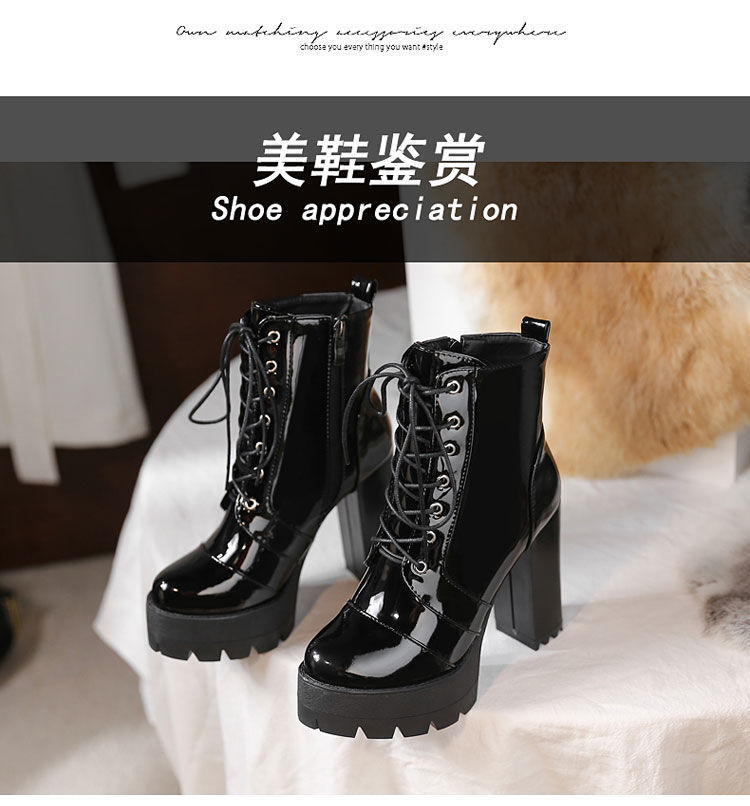 2022 봄과 가을 새로운 하이힐 앵클 부츠 여성용 청키 힐 라운드 토 방수 마틴 부츠 모든 매치 슬리브 짧은 래커 가죽 부츠