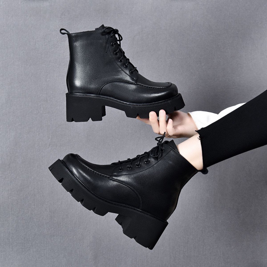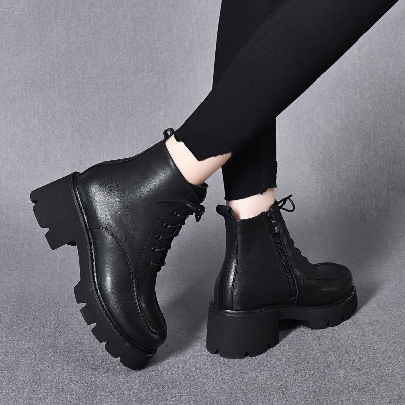 패션 두꺼운 바닥 마틴 부츠 여성의 가을과 겨울 2022 새로운 스타일 탑 레이어 소가죽 스트랩 플랫폼 하단 측면 지퍼 라운드 발가락 발목 부츠