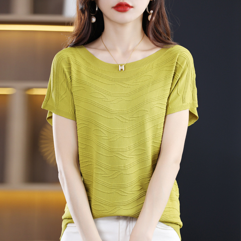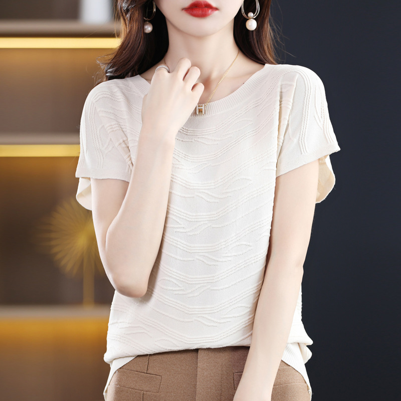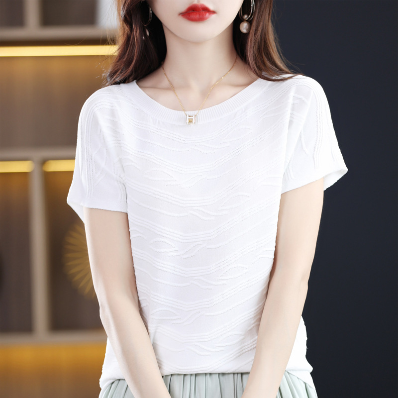 반팔 여성 라운드 넥 곡선 대나무 물결 무늬 다목적 티셔츠 느슨한 기질 통근 바닥 봄 여름 새로운 얼음 실크 반팔스토어 가기
