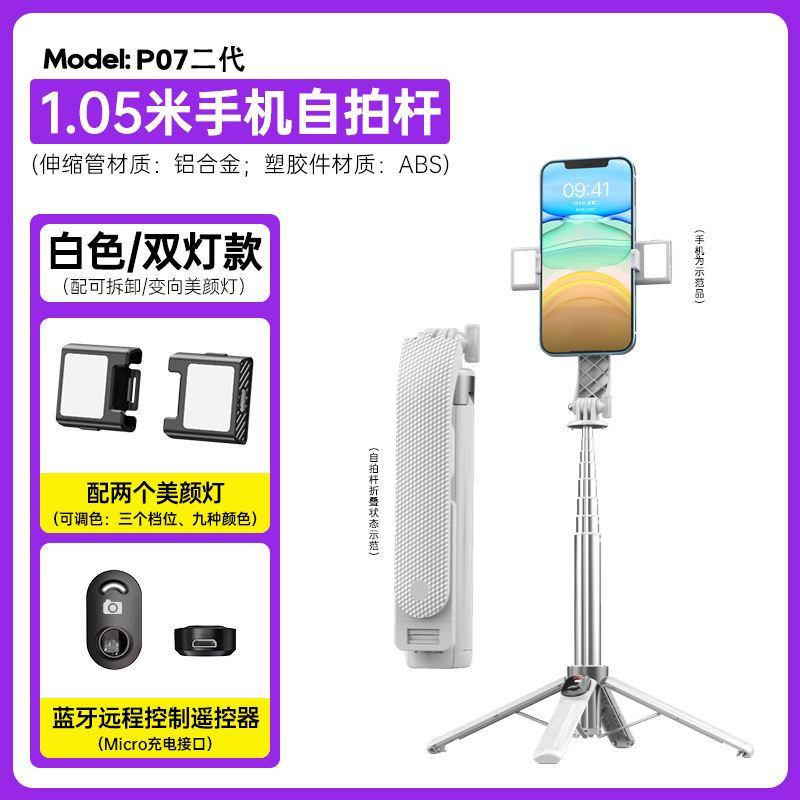 • P07 2 세대 휴대 전화 셀카 스틱/알루미늄 합금/더블 라이트 화이트