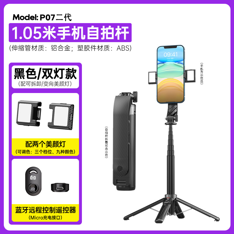 • P07 2 세대 휴대 전화 셀카 스틱/알루미늄 합금/더블 램프 블랙