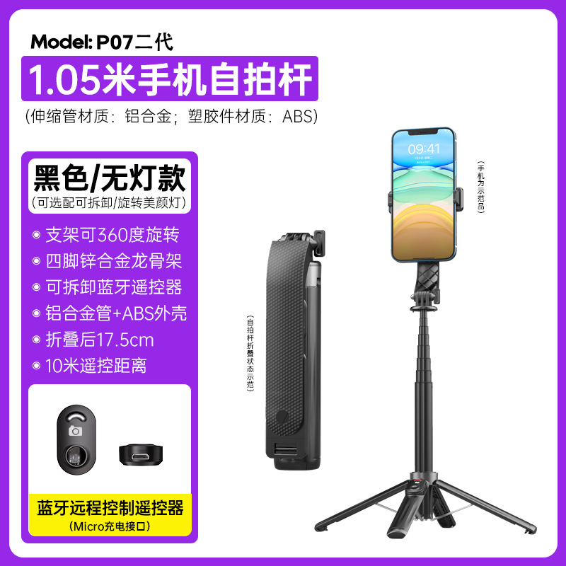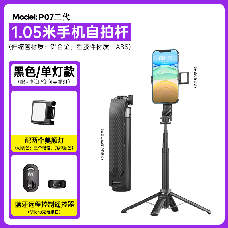 • P07 2 세대 휴대 전화 셀카 스틱/알루미늄 합금/단일 램프 블랙