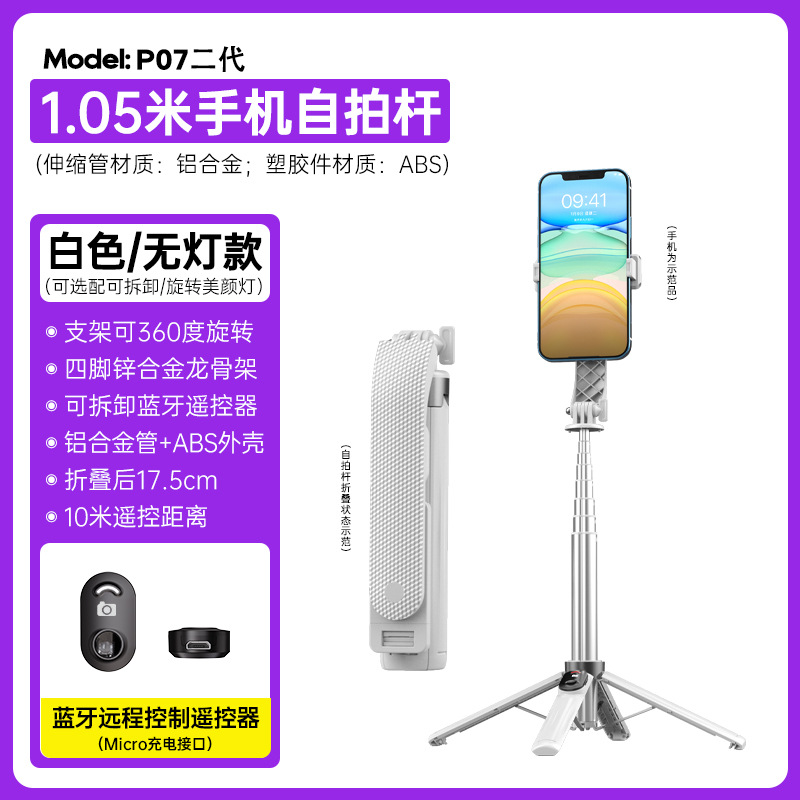 • P07 2 세대 휴대 전화 셀카 스틱/알루미늄 합금/단일 라이트 화이트