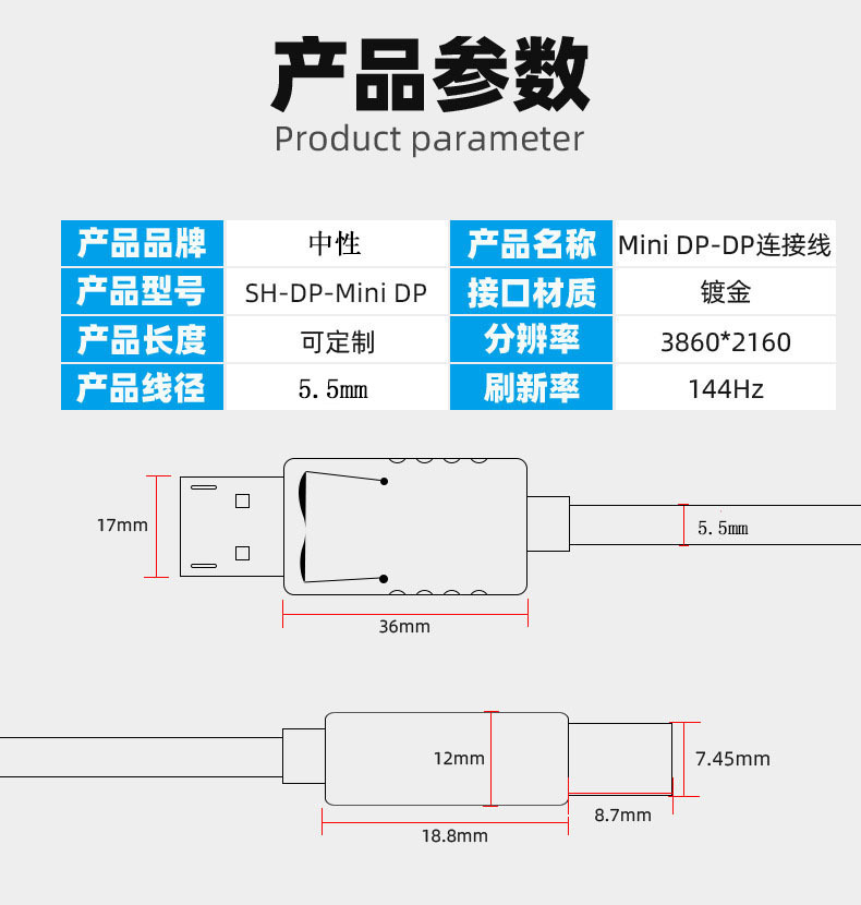 minidp转dp线4k雷电接口1.8米笔记本电脑显示器高清迷你DP转接线