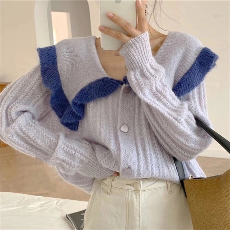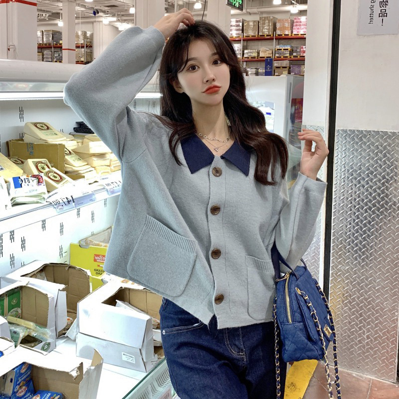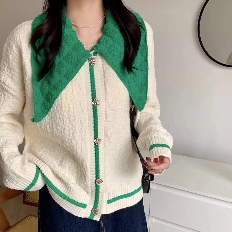 韩版新款慵懒风针织开衫女2022秋季甜美娃娃领撞色毛衣外套¥37立即采购