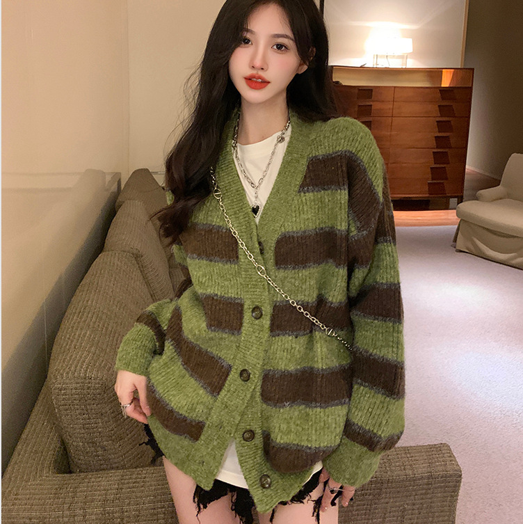 日系慵懒风毛衣女2022秋冬新款宽松撞色外套V领休闲条纹针织开衫¥32立即采购
