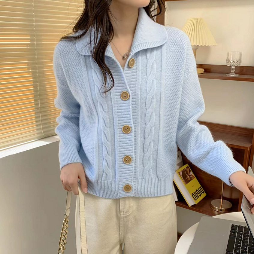 日系翻领针织开衫女2022秋季新款宽松外穿纯色麻花毛衣女外套¥42立即采购
