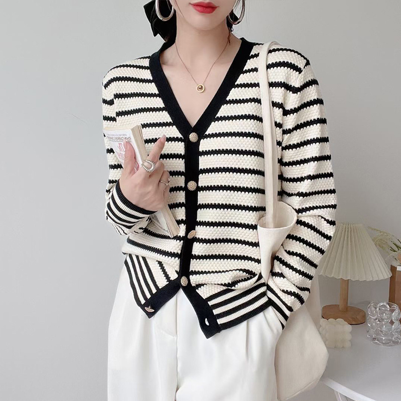 气质名媛V领针织女开衫2022秋季新款宽松条纹设计感毛衣女外套¥39立即采购