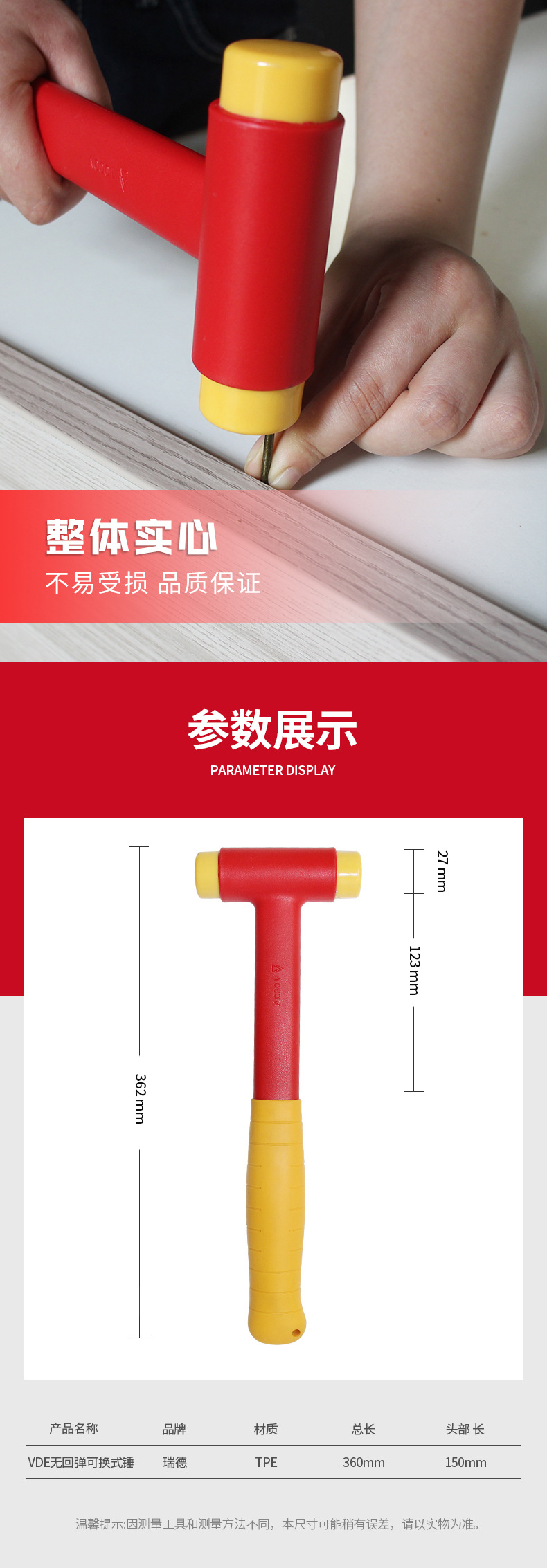 1000V 고전압 절연 전기 기사 특수 VDE 비 리바운드 교체 가능한 해머 하드웨어 도구 목공 망치