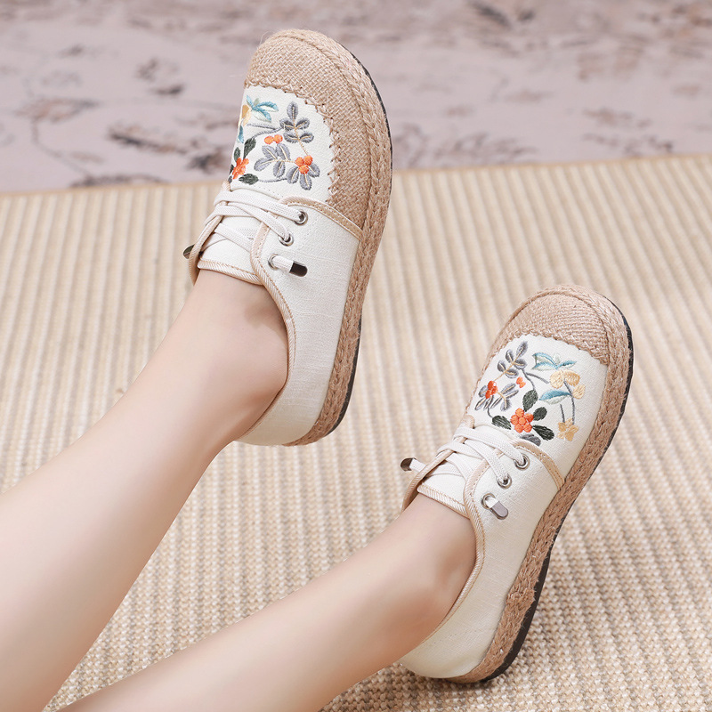 봄과 가을 새로운 어부 신발 올드 베이징 천 신발 여성용 에스닉 스타일 자수 신발 슬립온 게으른 캐주얼 큰 발가락 신발