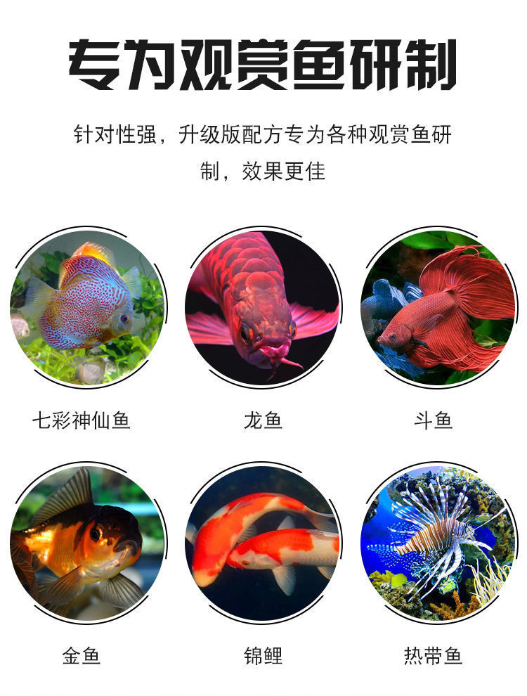 本品适用于咸、淡水观赏鱼、金鱼、锦鲤。