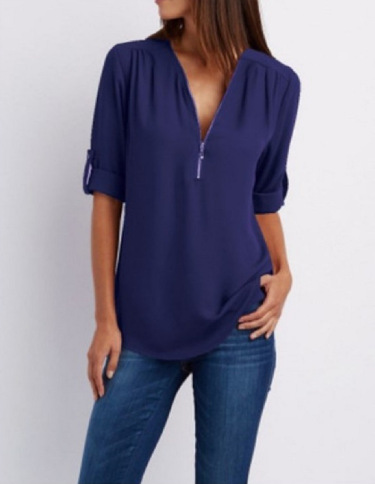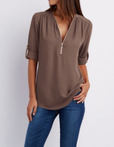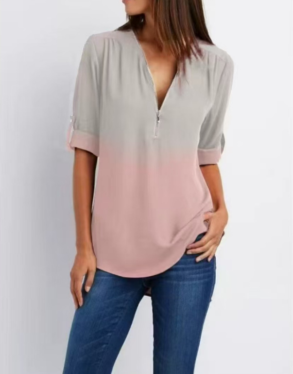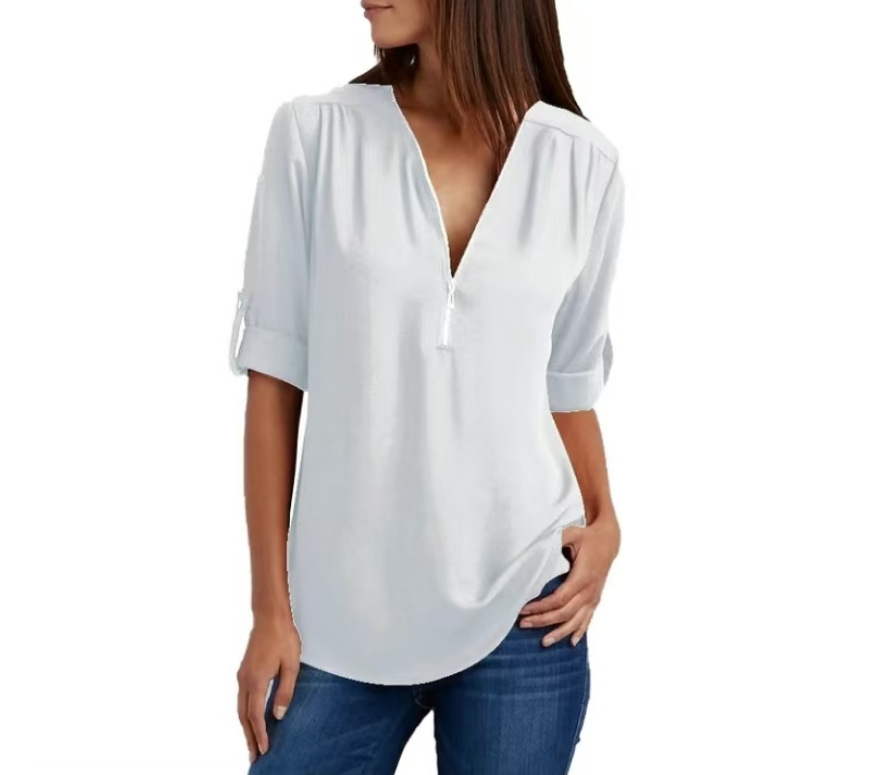 2024 이베이 유럽 및 미국 셔츠 V 넥 지퍼 플러스 사이즈 여성용 긴 소매 소매 소매 느슨한 쉬폰 셔츠 유럽과 미국스토어 가기