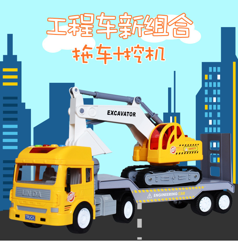 린다 장난감 자동차 8030-10 엔지니어링 차량 트레일러 + 굴삭기 어린이 장난감 시뮬레이션 엔지니어링 사운드 및 가벼운 음악 이야기