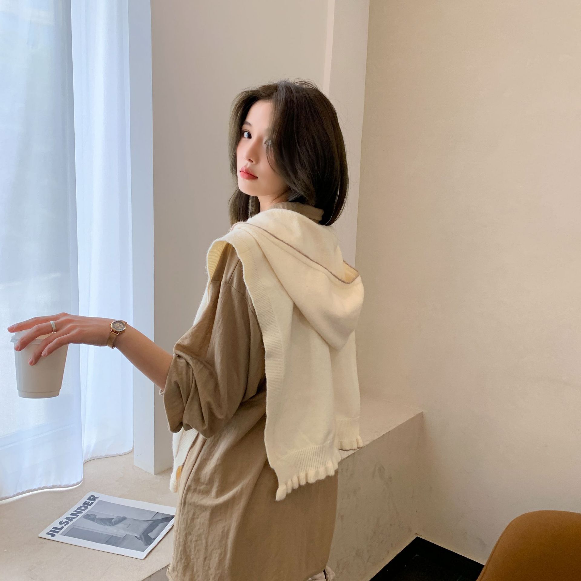 봄과 가을 한국 단색 후드 숄 캐시미어 니트 숄 스카프 달콤한 외부 장식 에어컨 숄 여성스토어 가기