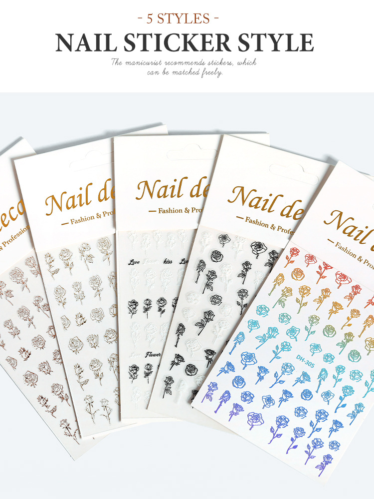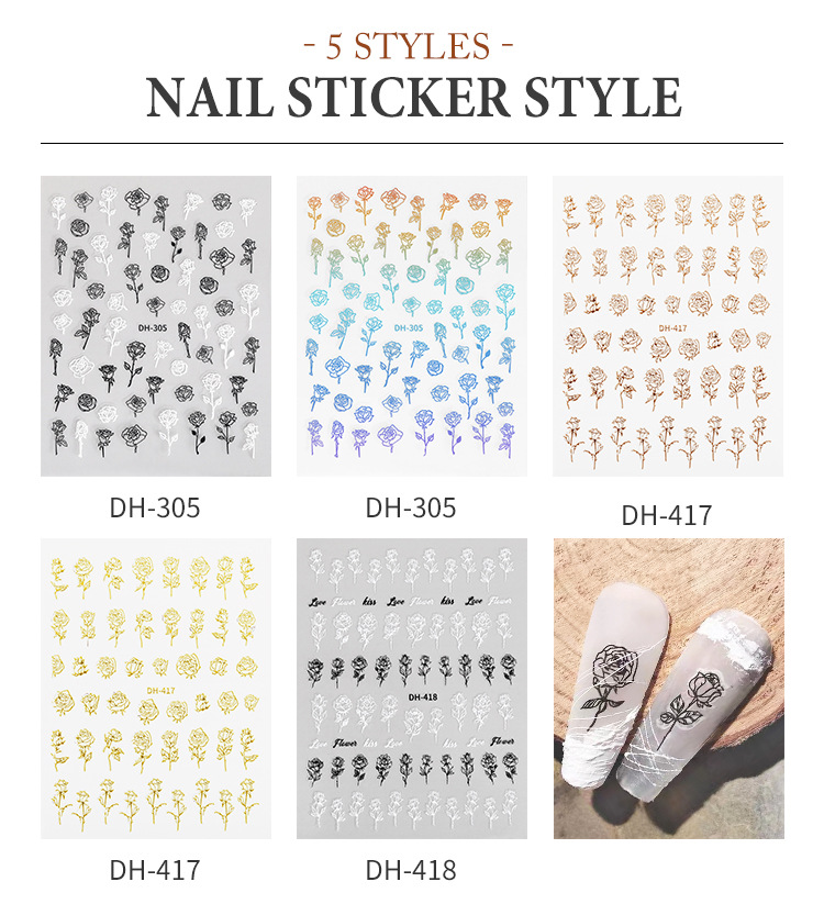 크로스 보더 핫 로즈 네일 스티커 3D 입체 흑백 손으로 그린 스케치 꽃 접착제 단색 중공 네일 스티커