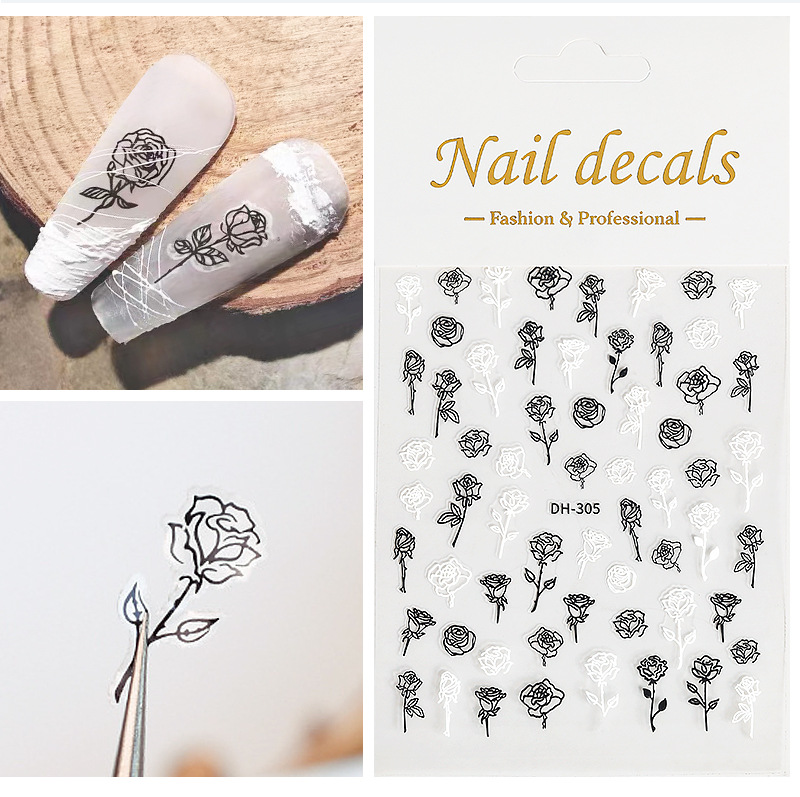크로스 보더 핫 로즈 네일 스티커 3D 입체 흑백 손으로 그린 스케치 꽃 접착제 단색 중공 네일 스티커스토어 가기