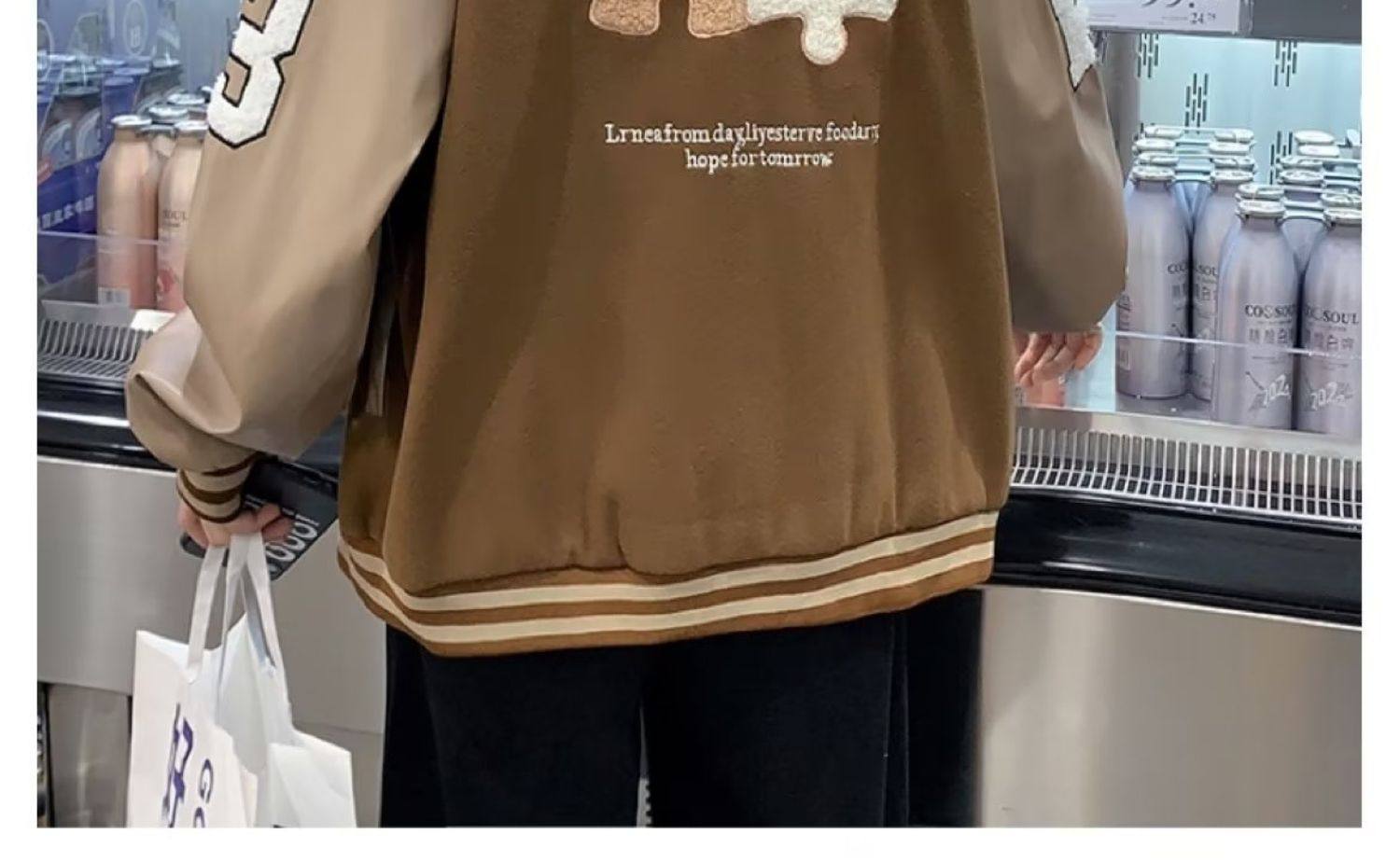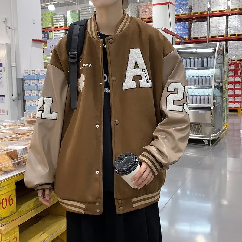 높은 거리 가을과 겨울 커플 복고풍 커피 퍼즐 PU 가죽 자수 재킷 코트 남자의 어깨 소매 면 야구 세트스토어 가기