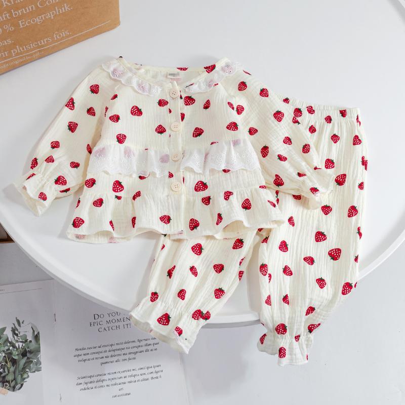 여아 잠옷 봄, 가을 2025 신상 아동 여아 딸기 레이스 스타일 홈웨어 세트 면 트렌디