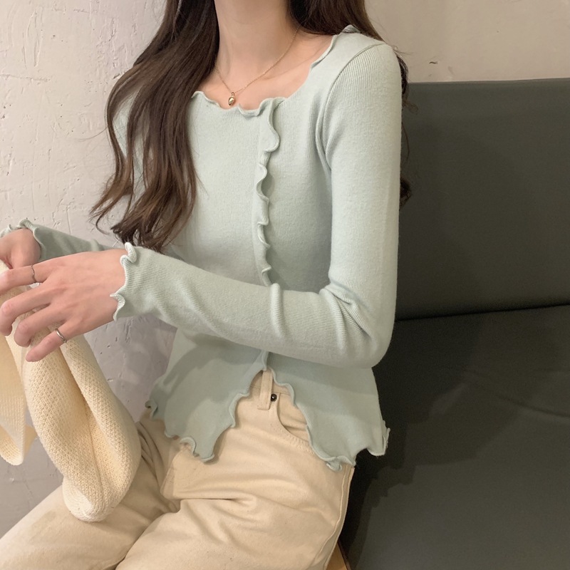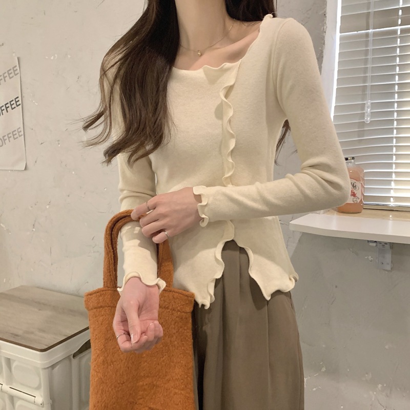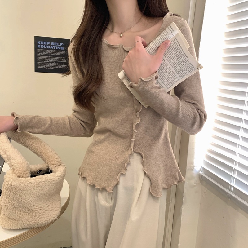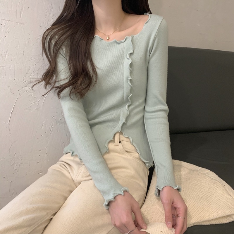 2240#不规则开叉木耳边内搭针织衫女秋冬修身纯欲毛衣打底衫上衣