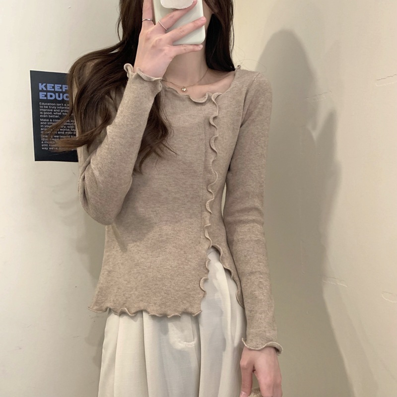불규칙한 트임과 러플 디테일이 있는 여성용 니트 스웨터 2025 가을 겨울 슬림핏 순수한 매력의 스웨터 베이스 레이어 탑