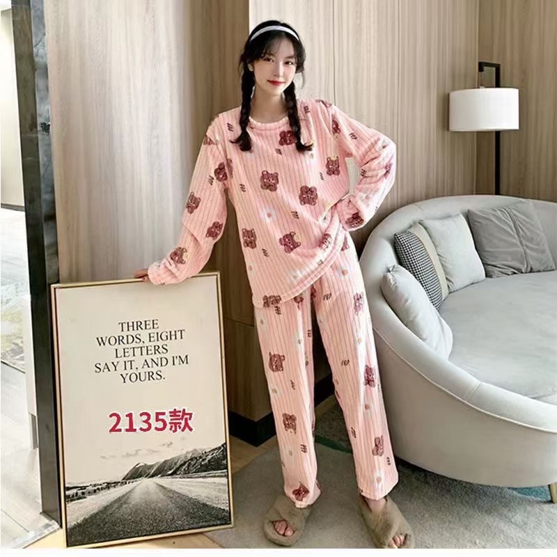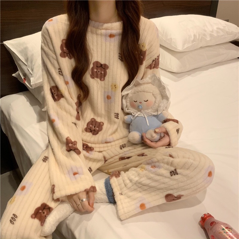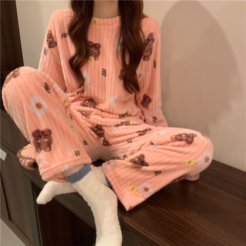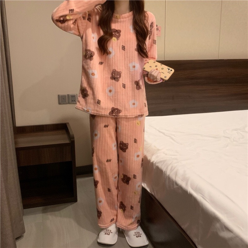 산호 양털 곰 인쇄 따뜻한 세트 겨울 캐주얼 편안한 잠옷 귀여운 만화 소녀의 가정 옷 투피스 세트스토어 가기