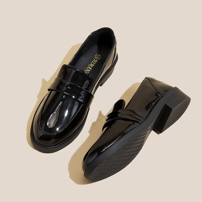2025 봄 가을 신상 패셔너블하고 다재다능한 페이턴트 가죽 광택 와이드 밴드 브라이트 글로시 브리티시 스타일 여성용 작은 가죽 신발, 두꺼운 굽과 낮은 굽스토어 가기