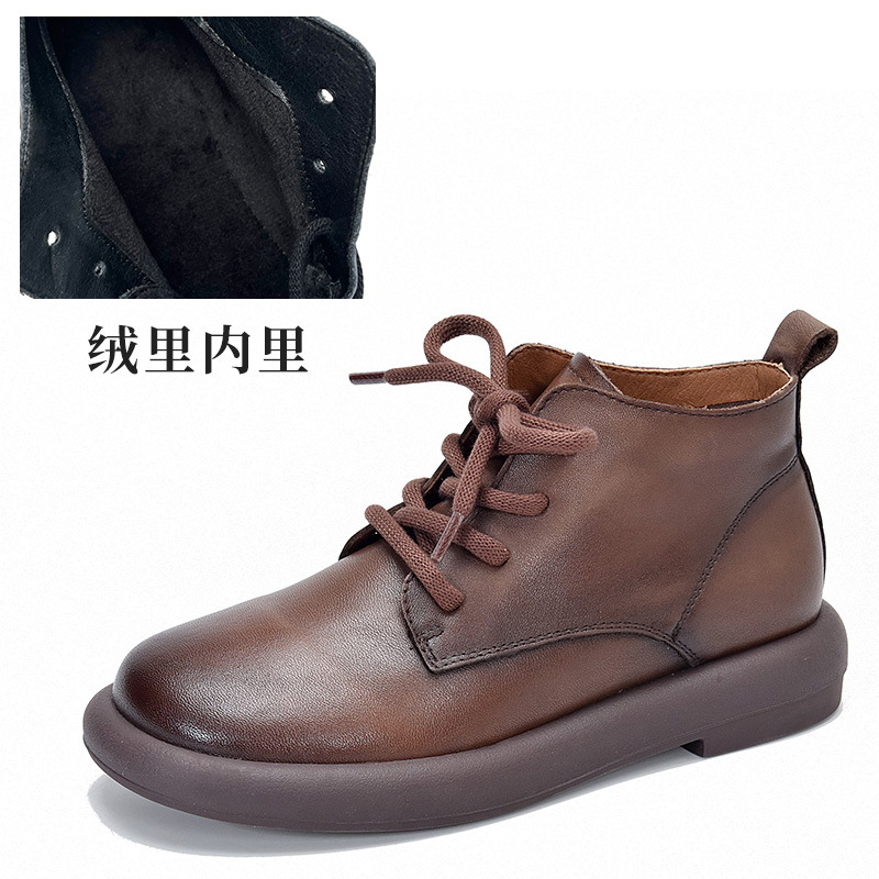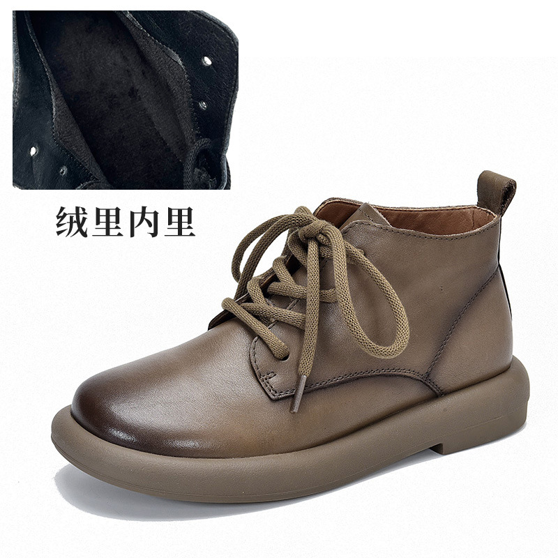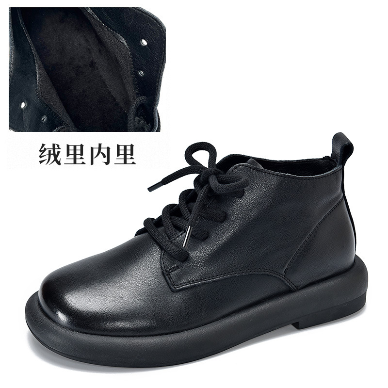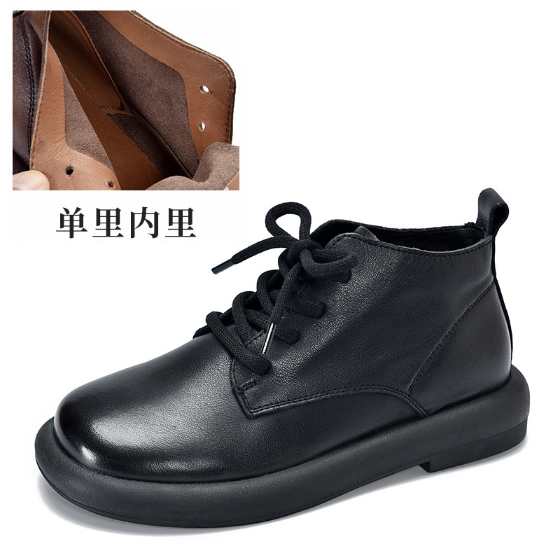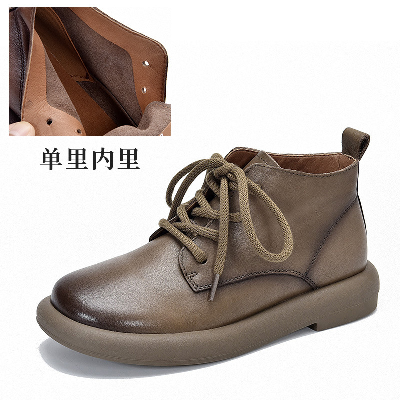 1층 소가죽 숏부츠 여성용 라운드 토 플랫 힐 부드러운 가죽 숏부츠 2025 가을 겨울 레트로 다용도 싱글 부츠 레이스업 마틴 부츠스토어 가기