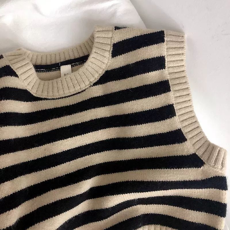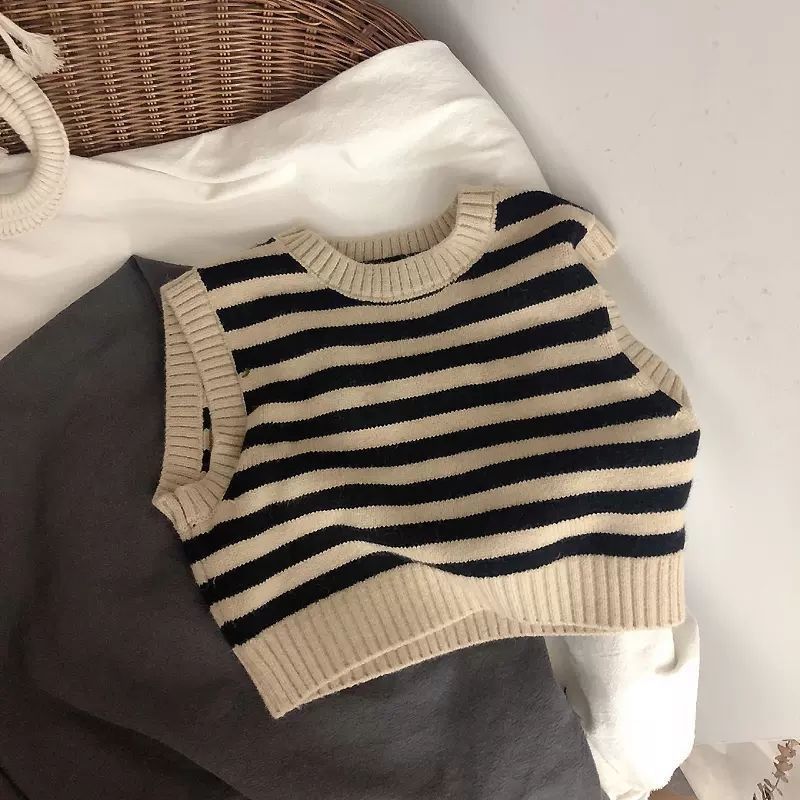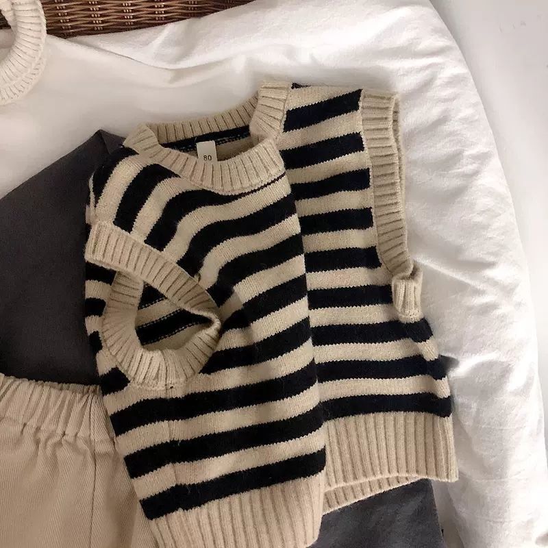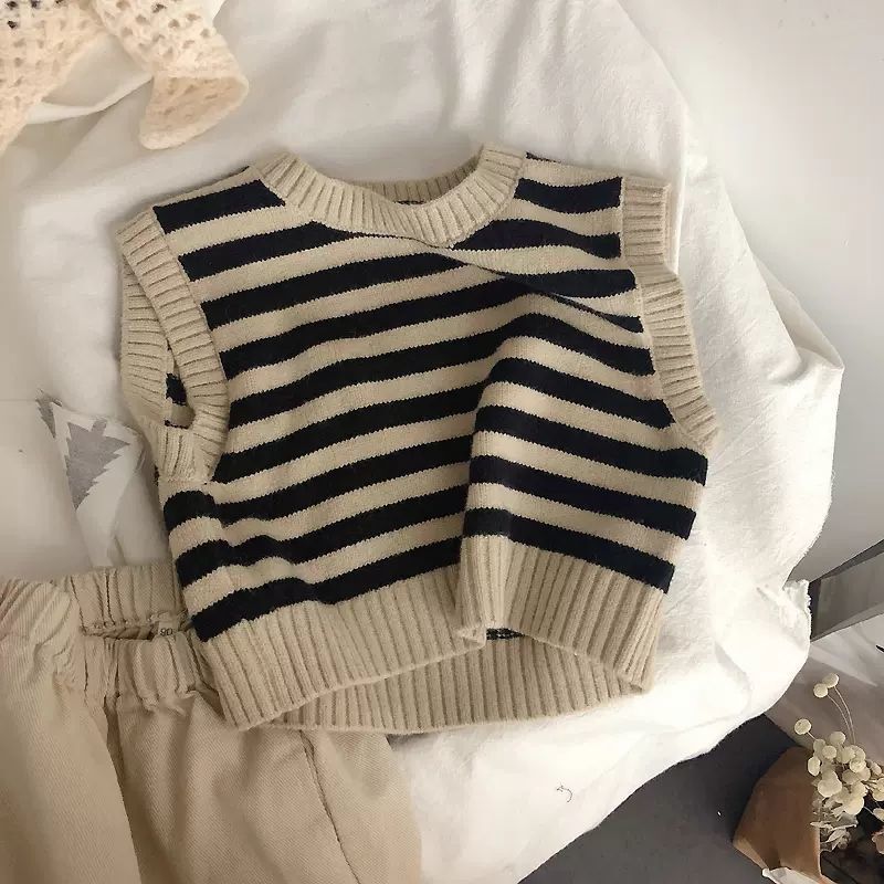 Ins 인기 한국 어린이 줄무늬 자카드 조끼 니트 조끼 아기 스웨터 양복 조끼 풀오버 봄스토어 가기