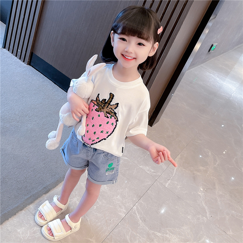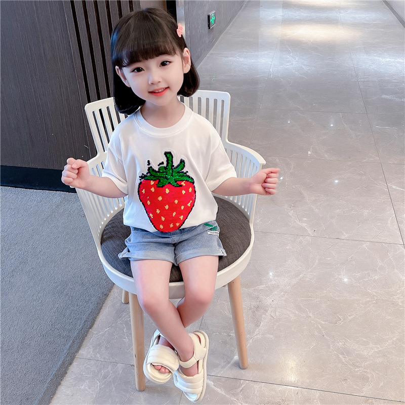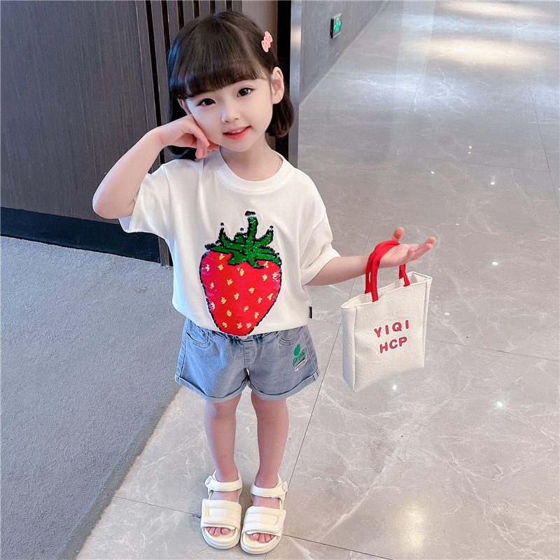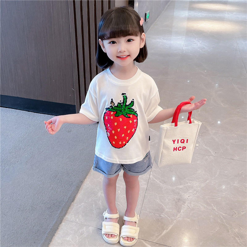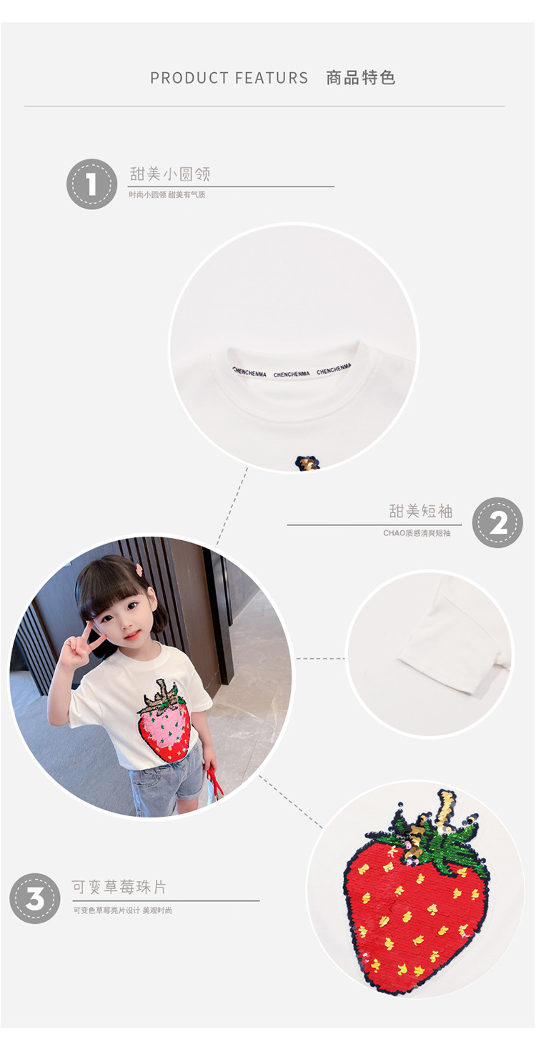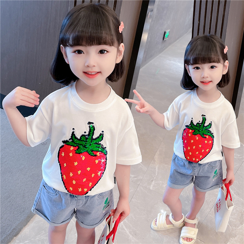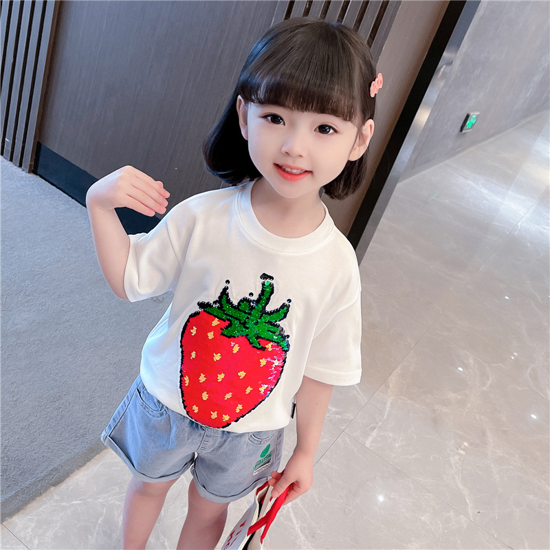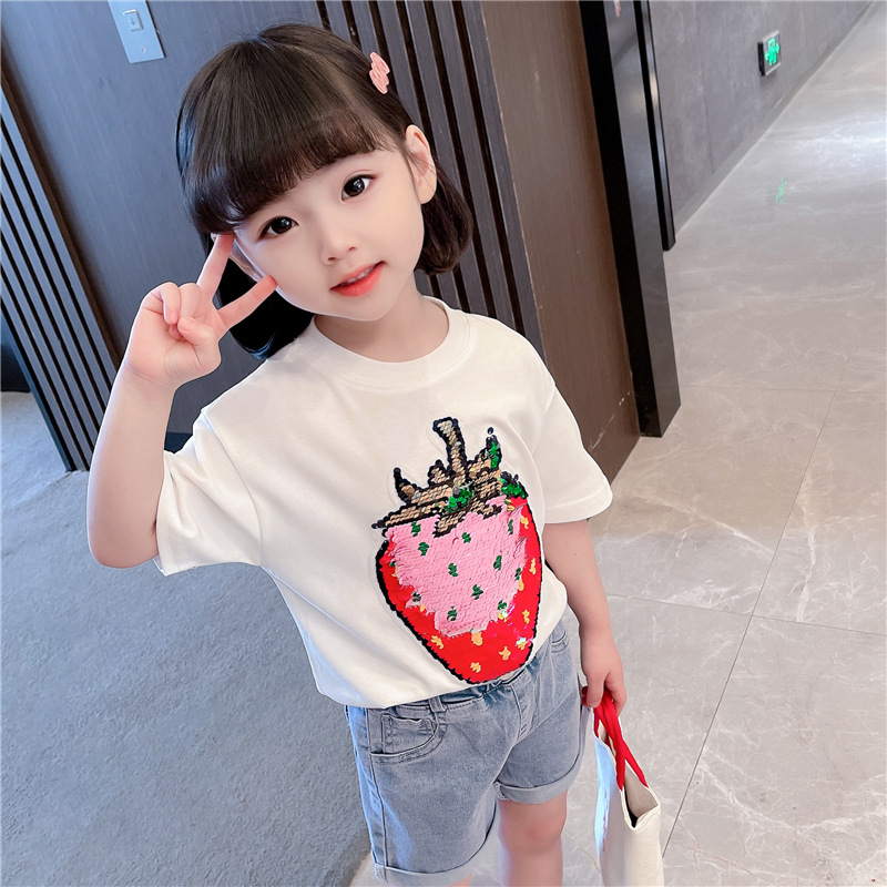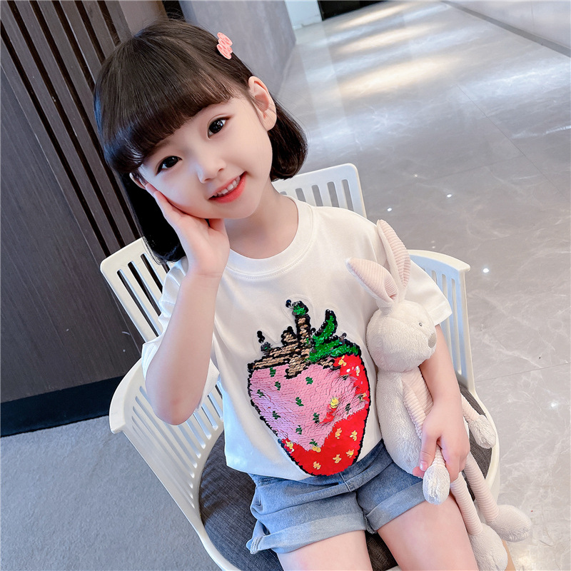 [두 가지 색상 스팽글] 색상 변경 딸기 스팽글 티셔츠 소년 소녀를위한 여름 캐주얼 탑 재미있는 아동 의류스토어 가기