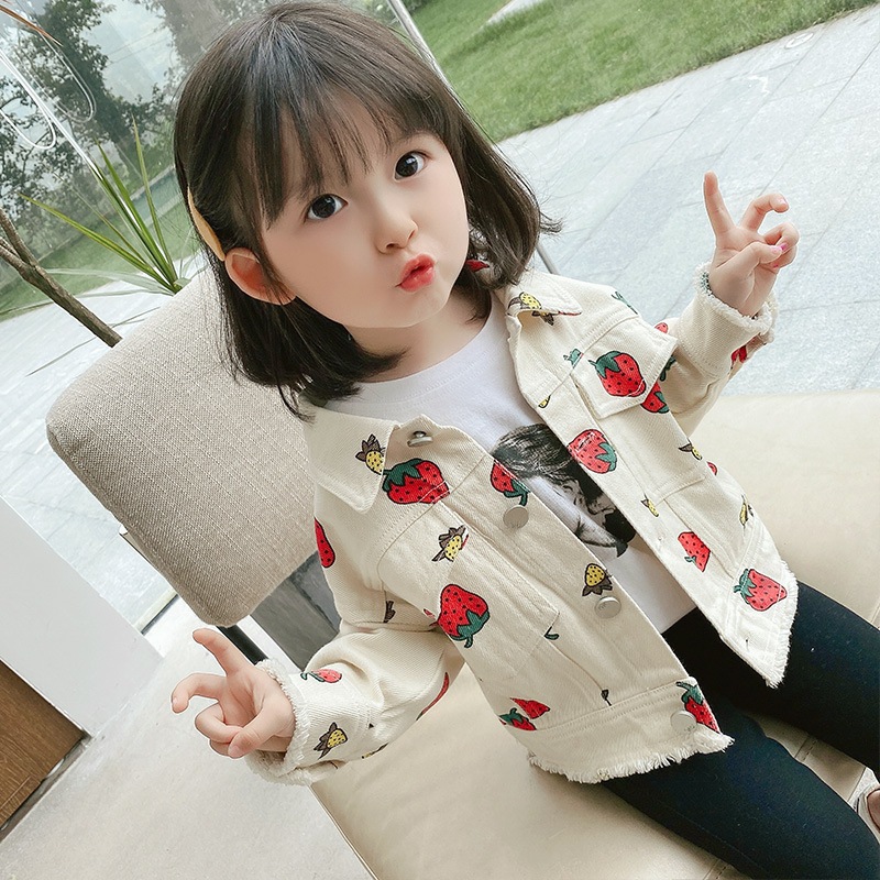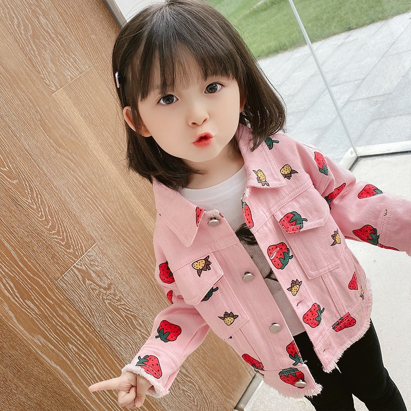 봄과 가을 여아 코트 베이비 온라인 인기있는 외국 스타일 어린이의 성격 트렌디 한 한국 스타일 귀여운 딸기 러플 청바지 재킷스토어 가기