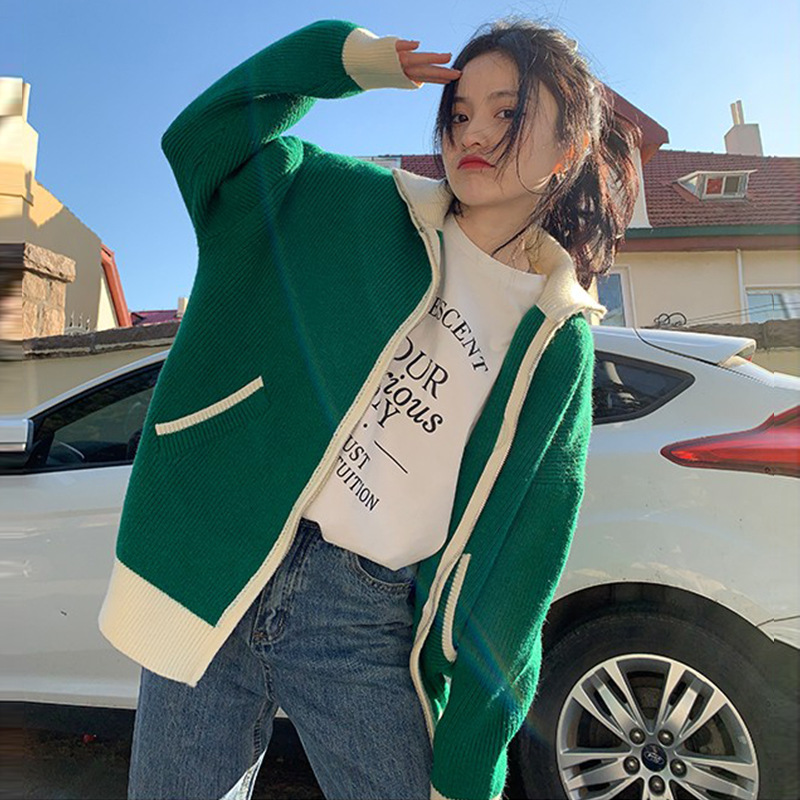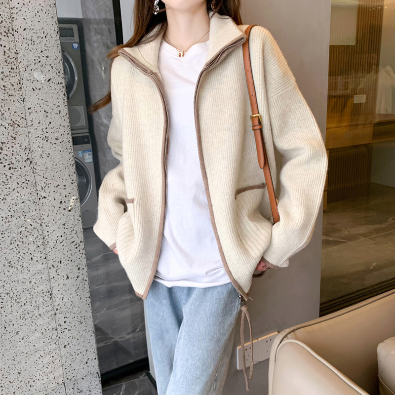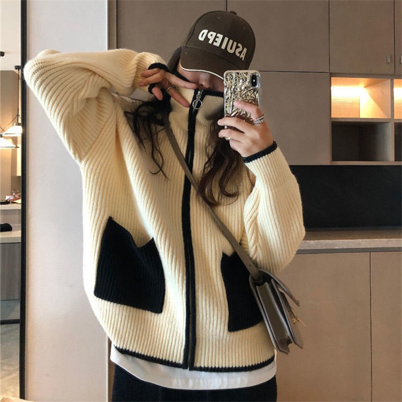 日系斜口袋拉链毛衣女外套2022秋冬新款宽松撞色休闲针织开衫女¥47立即采购