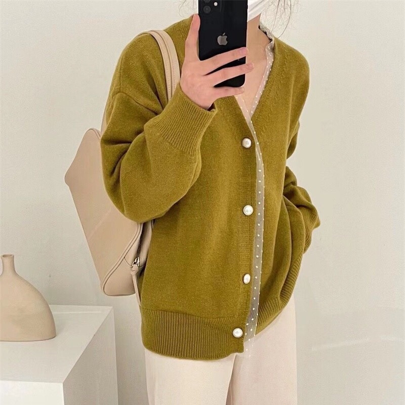 韩系蕾丝拼接慵懒风针织开衫女2022秋季新款V领纯色毛衣女外套¥37立即采购