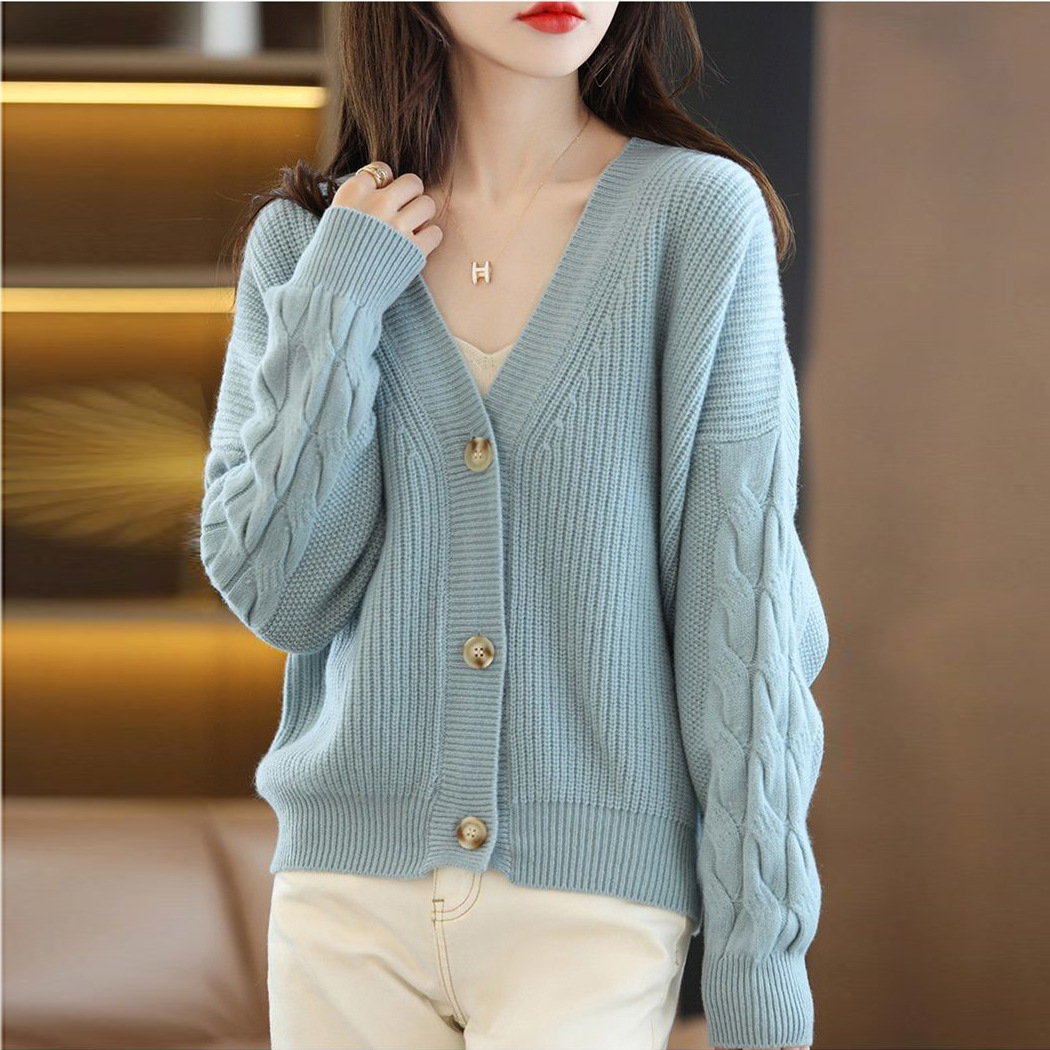 V领纯色针织开衫女2022秋冬新款麻花长袖宽松毛衣女外套¥35立即采购