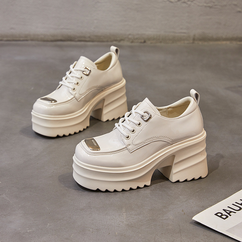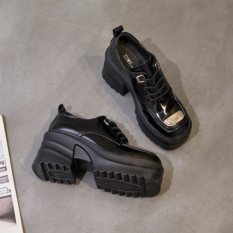 영국 스타일 작은 가죽 신발 여성용 두꺼운 밑창 2022 정품 가죽 하이힐 슬리퍼 레이스 업 라운드 헤드 두꺼운 굽 로퍼 여성스토어 가기