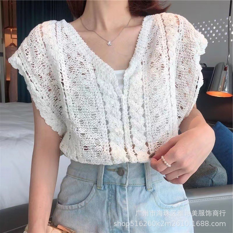 한국식 크로 셰 뜨개질 중공 V 넥 얇은 조끼 여성용 디자인 감각 틈새 짧은 스택 스타일 예술적 민소매 탑스토어 가기