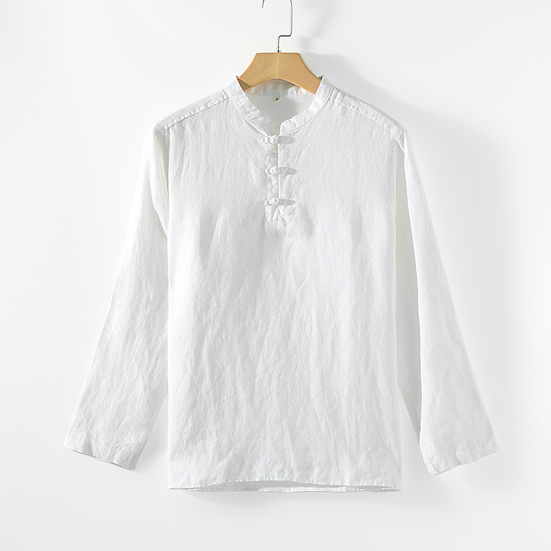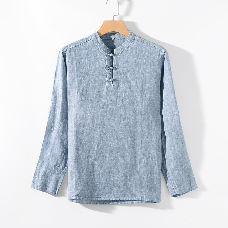2025 봄 리넨 남성 중국어 스탠드 칼라 리넨 셔츠 캐주얼 느슨한 통기성 긴팔 탑 B002