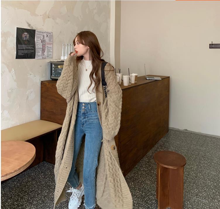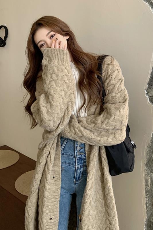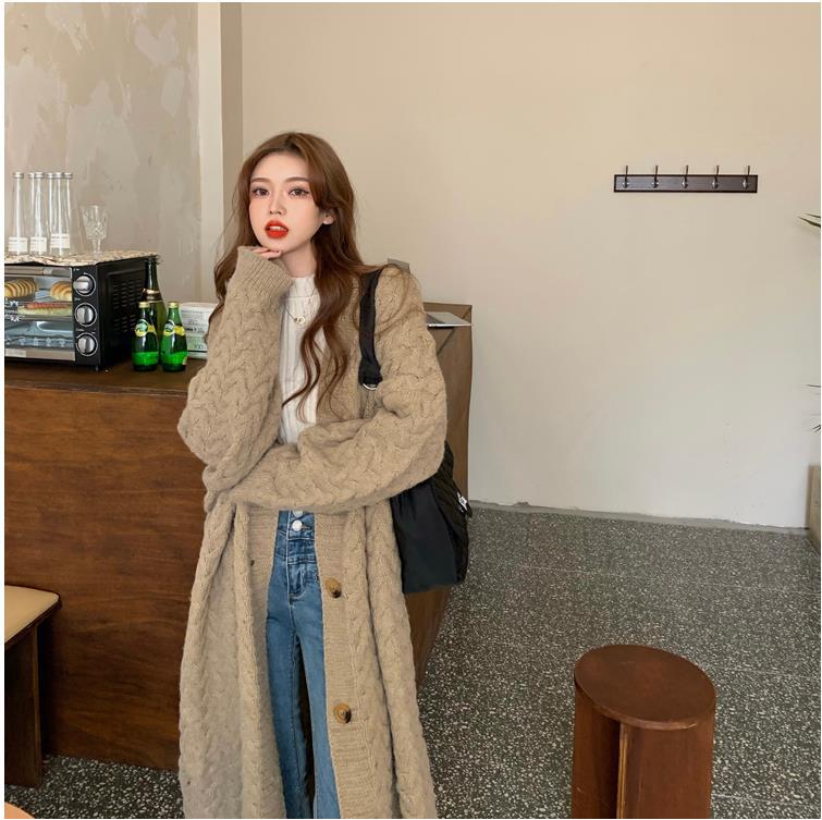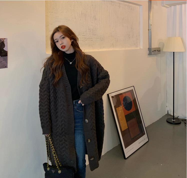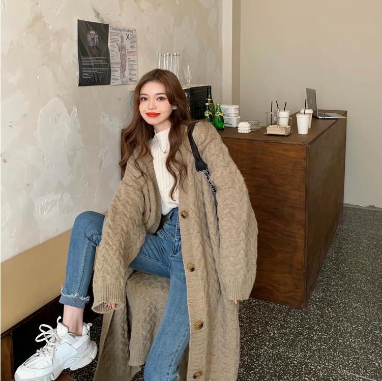 니트 가디건 재킷 여성의 한국 스타일 트위스트 무릎 위 가을과 겨울 모든 매치 게으른 스타일 느슨한 두꺼운 긴 겉옷 스웨터스토어 가기