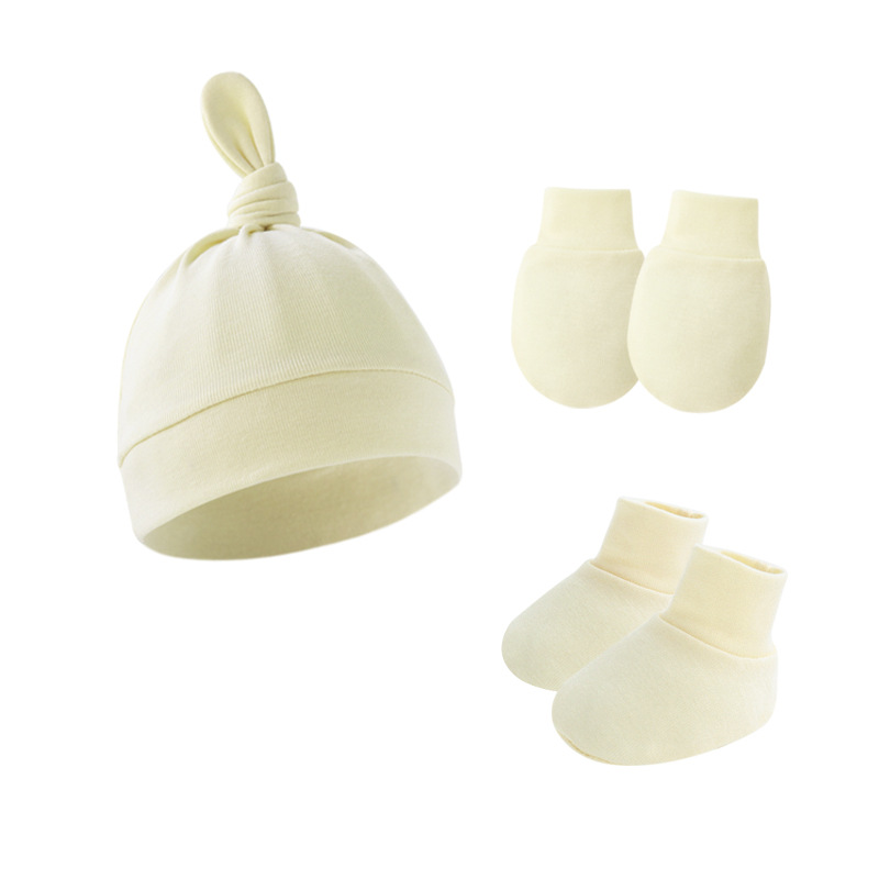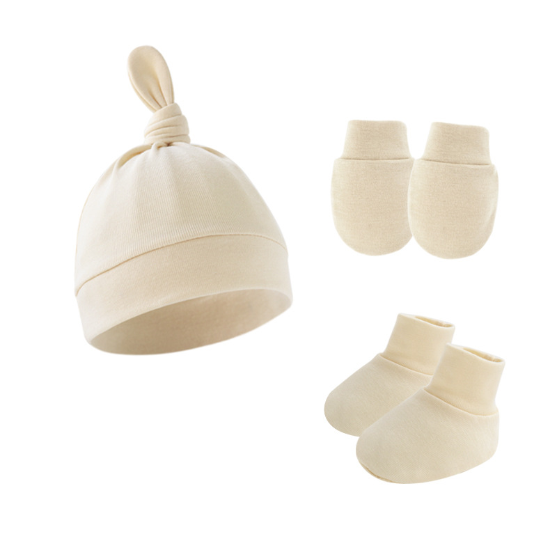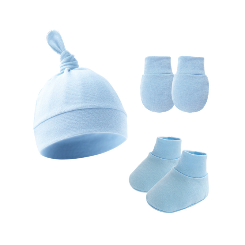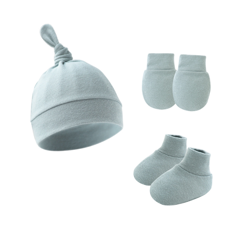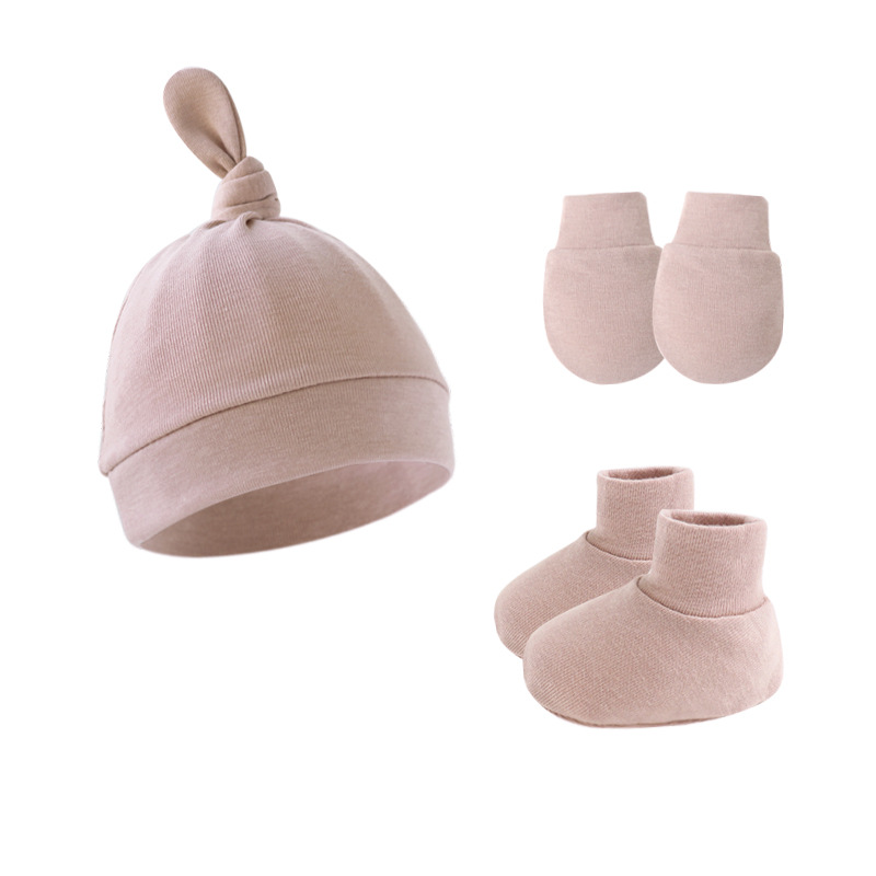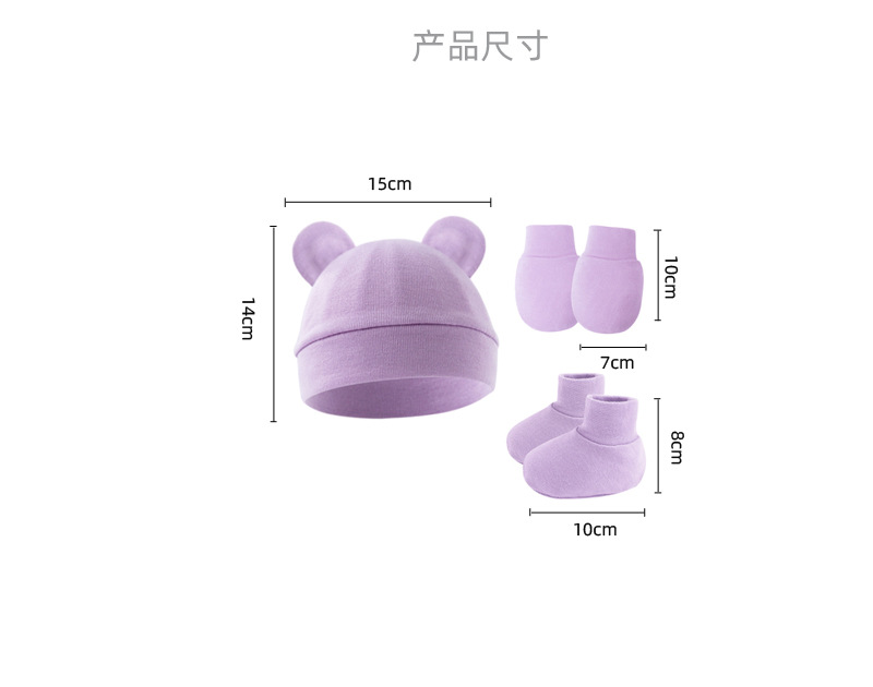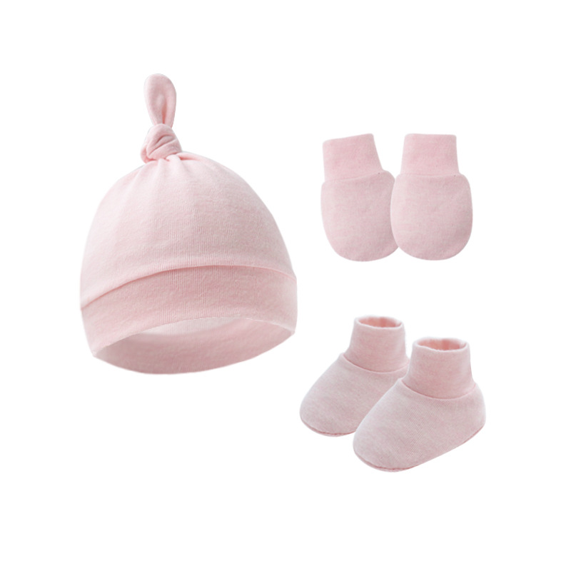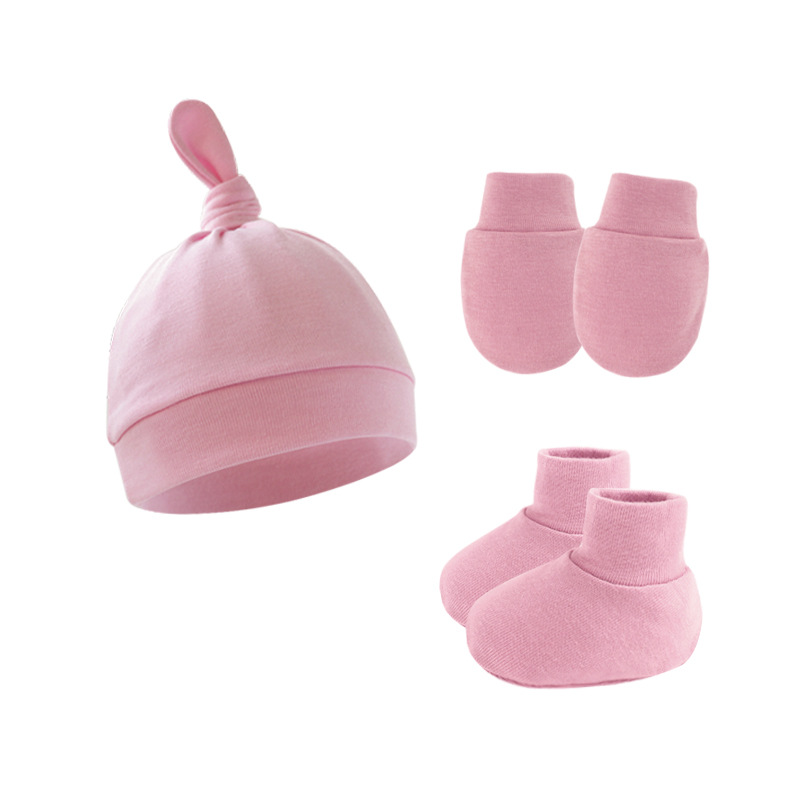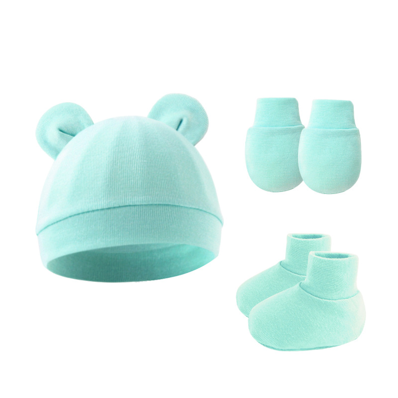 대외 무역 단색 아기 풀오버 모자 귀 아기 태아 모자 장갑 발 세트 3 조각 세트 0-6 개월스토어 가기