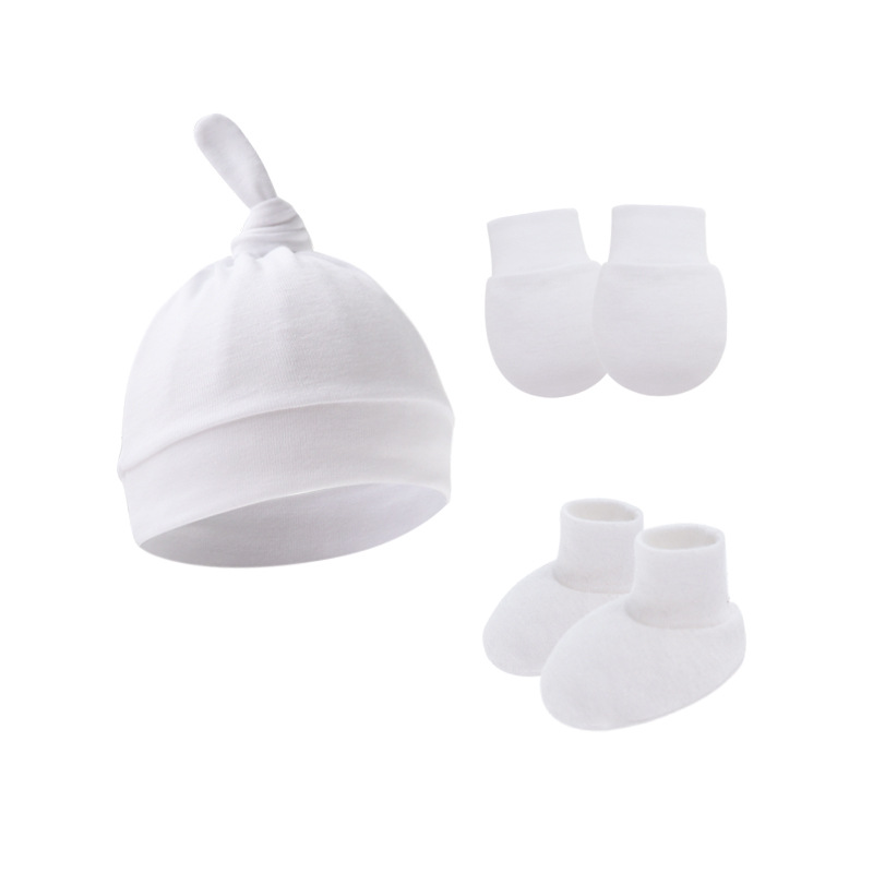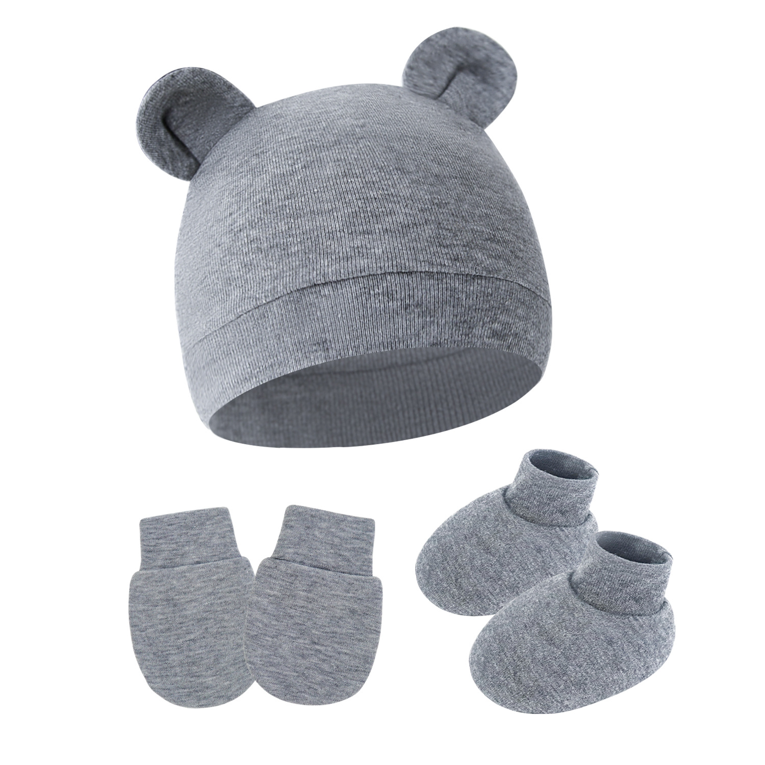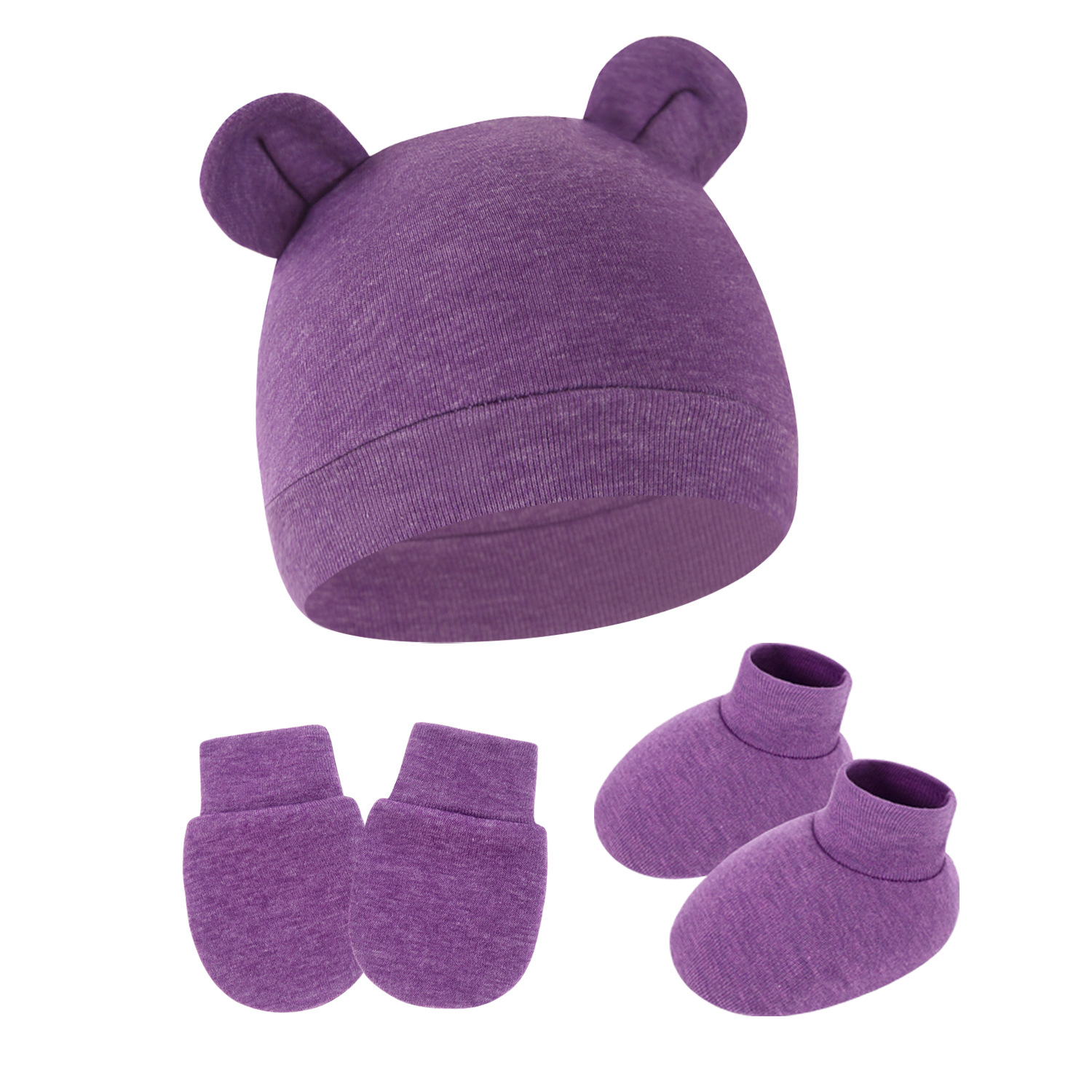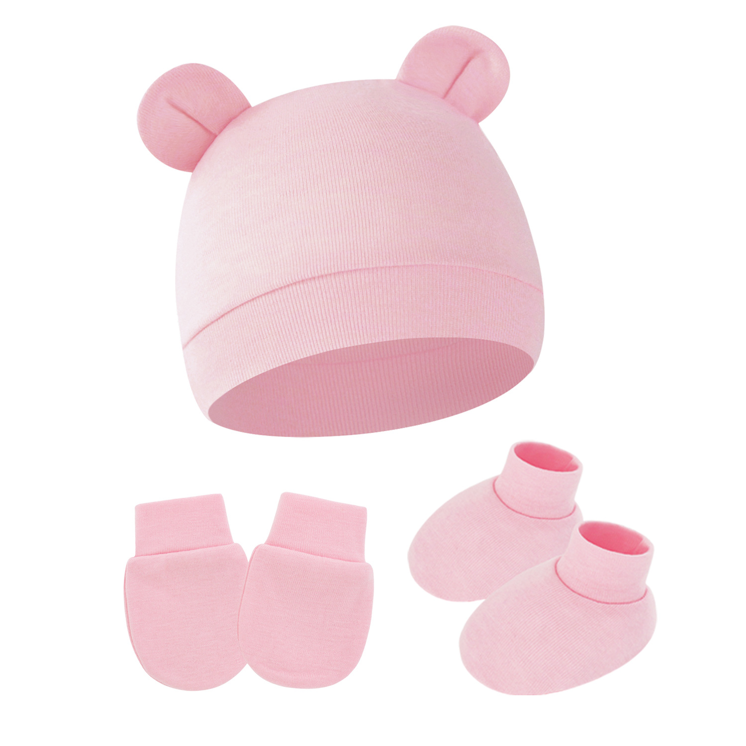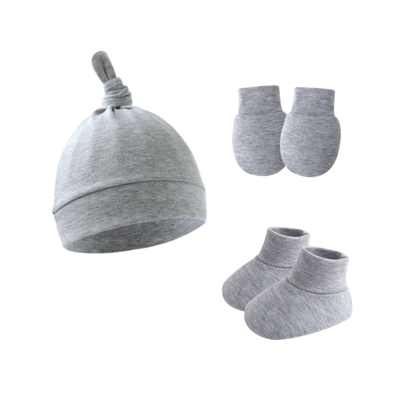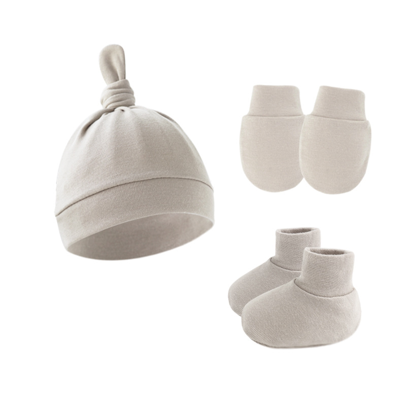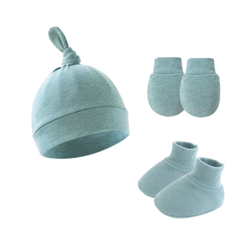 대외 무역 단색 아기 풀오버 모자 귀 아기 태아 모자 장갑 발 세트 3 조각 세트 0-6 개월스토어 가기