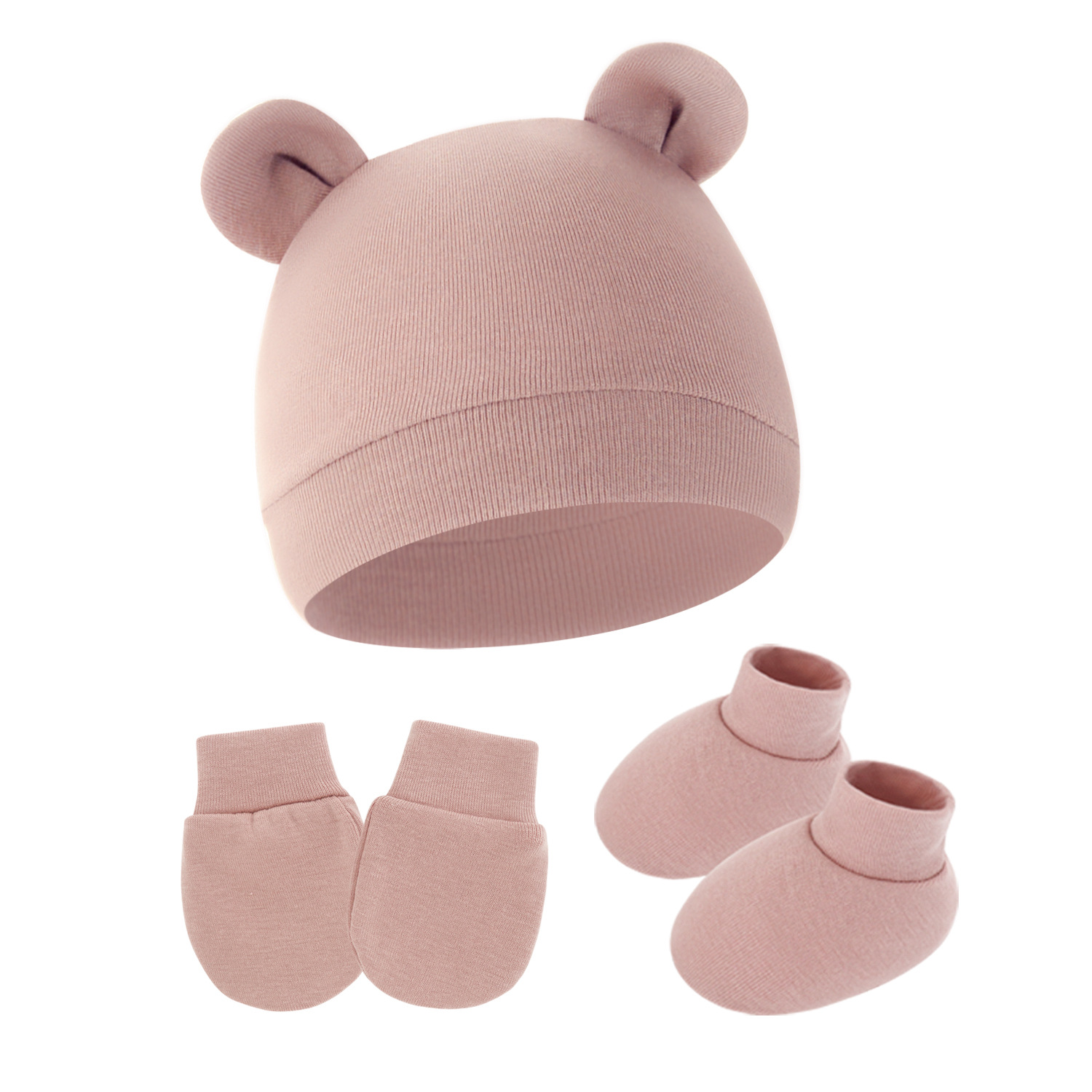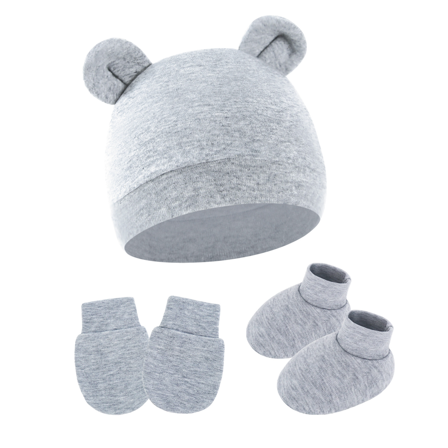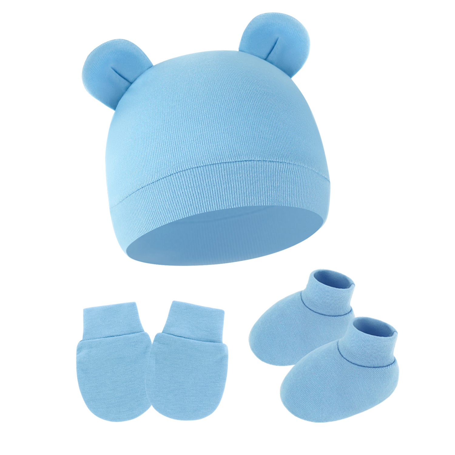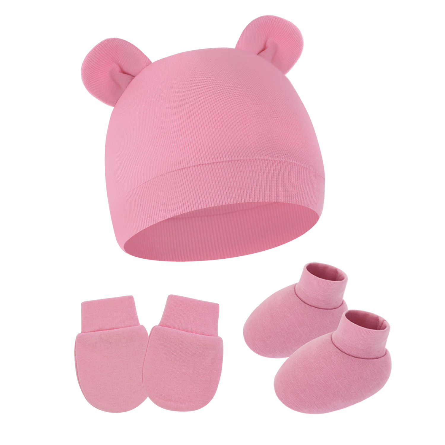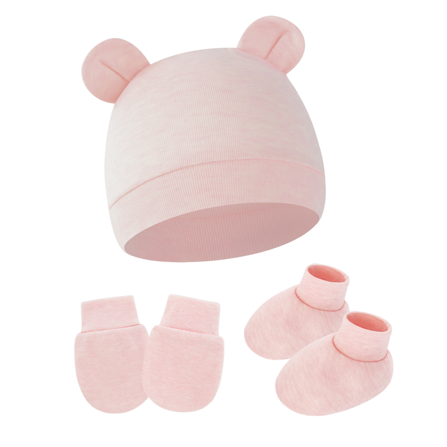 대외 무역 단색 아기 풀오버 모자 귀 아기 태아 모자 장갑 발 세트 3 조각 세트 0-6 개월스토어 가기